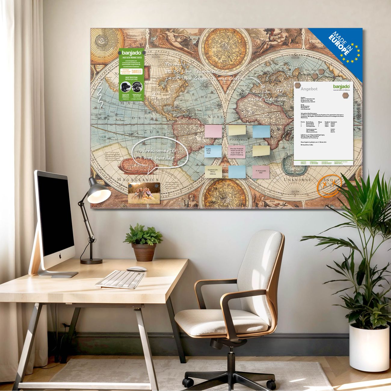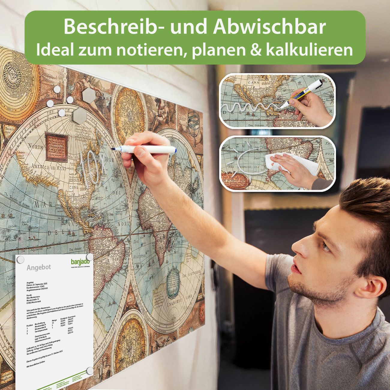 Jede Glas Magnettafel wird in unserer Werkstatt von Hand gefertigt und sorgfältig geprüft. So erhalten Sie ein echtes Qualitätsprodukt, das Funktion und Ästhetik perfekt vereint.?? Warum banjado?