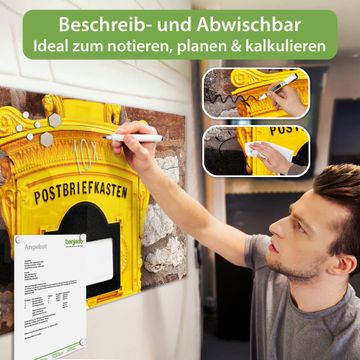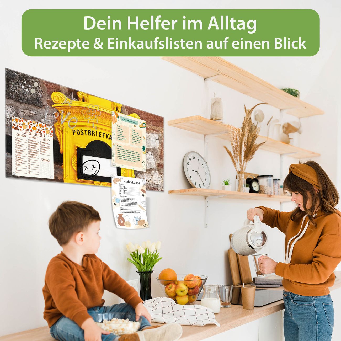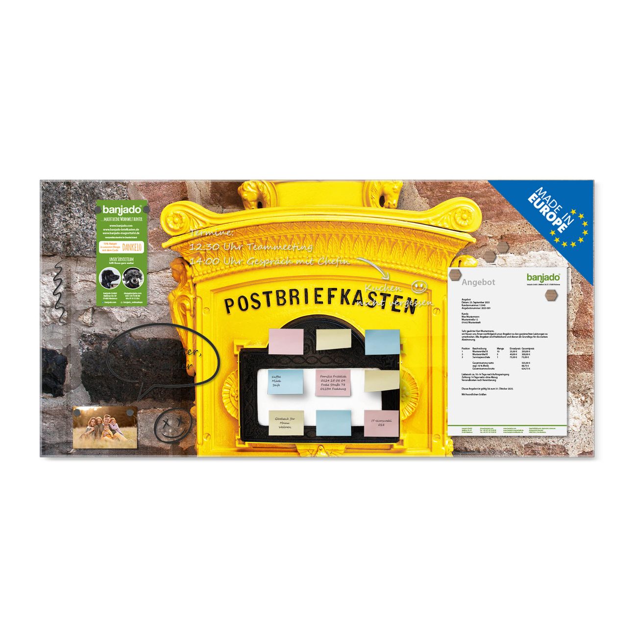 Material: 4mm Sicherheitsglas mit Metallrückwand Eigenschaften: beschreibbar, magnetisch, kratzfest Maße: 100x50x0,6cm, 7,50kg schwer Motiv Nummer 10337 Historischer Postkasten Zubehör: inklusive 4 Neodym-Magnete
