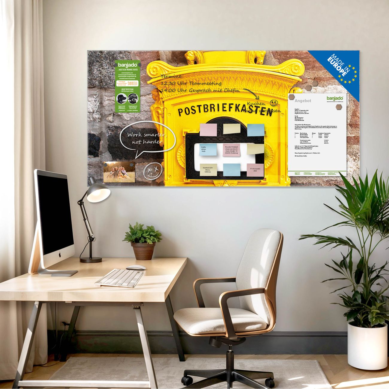 Die banjado Glas Magnettafel mit dem Motiv Motiv Historischer Postkasten verbindet Funktionalität mit Stil. Sie ersetzt das Zettelchaos durch klare Strukturen und bringt dabei eine warme, natürliche Atmosphäre in Ihr Zuhause. Ob im Büro, in der Küche oder im Eingangsbereich - dieses Design-Board zieht Blicke an und sorgt für Ordnung mit Charakter.