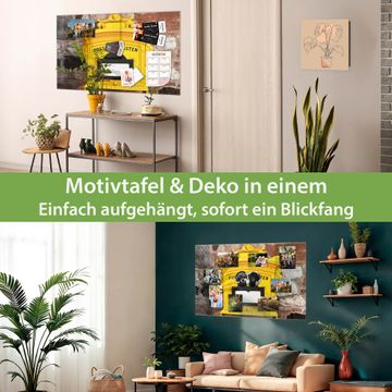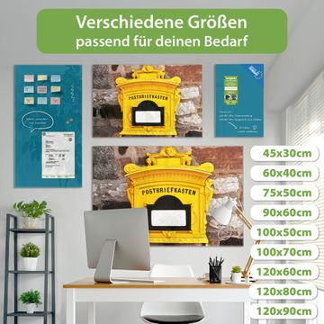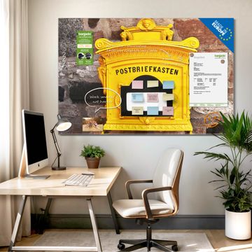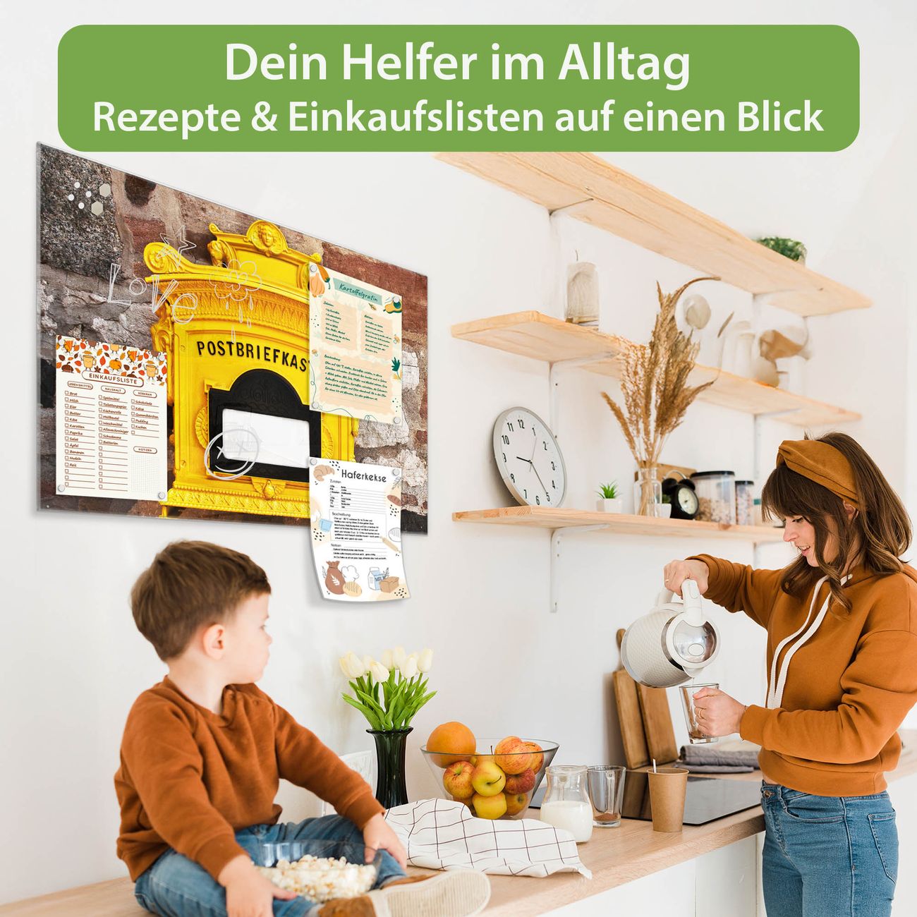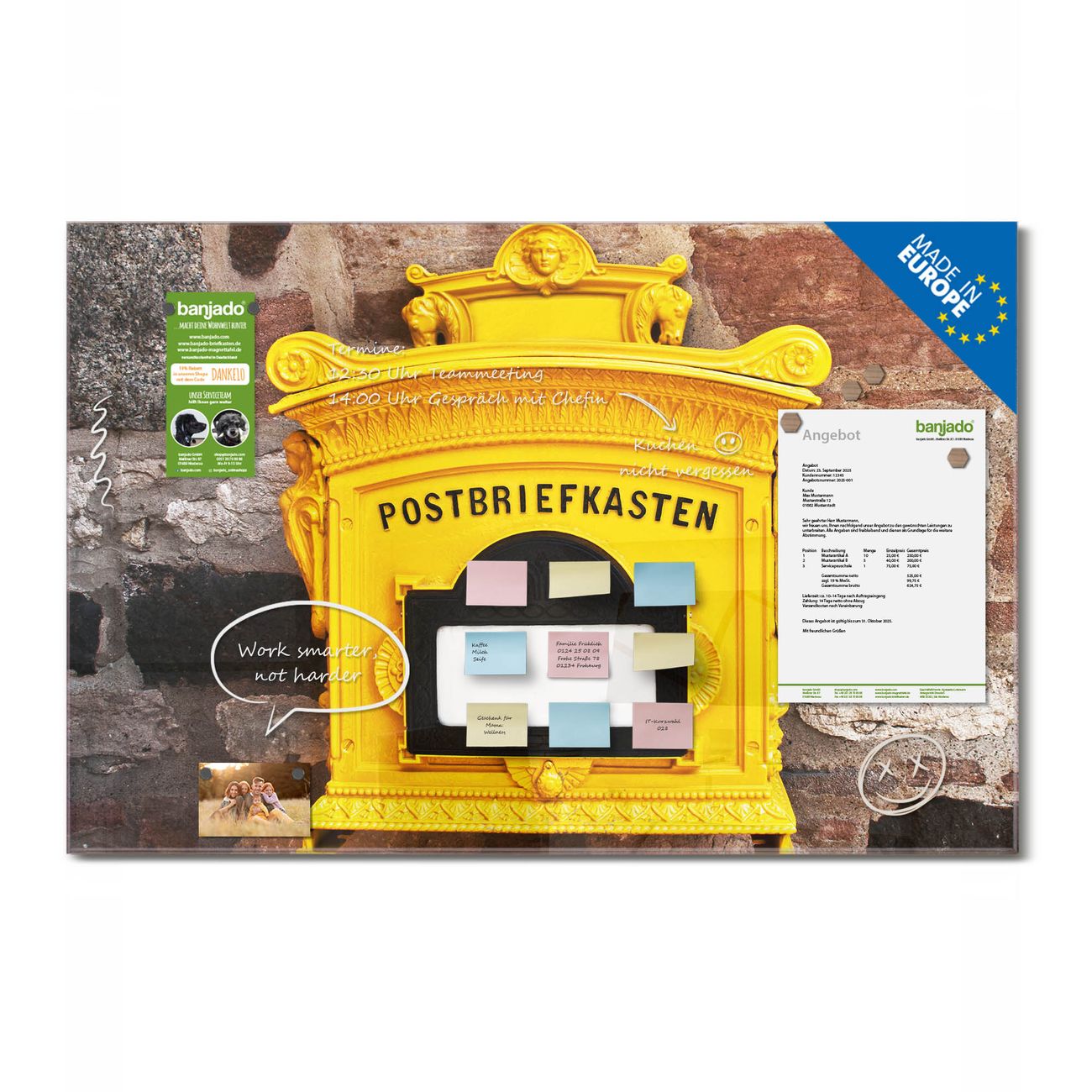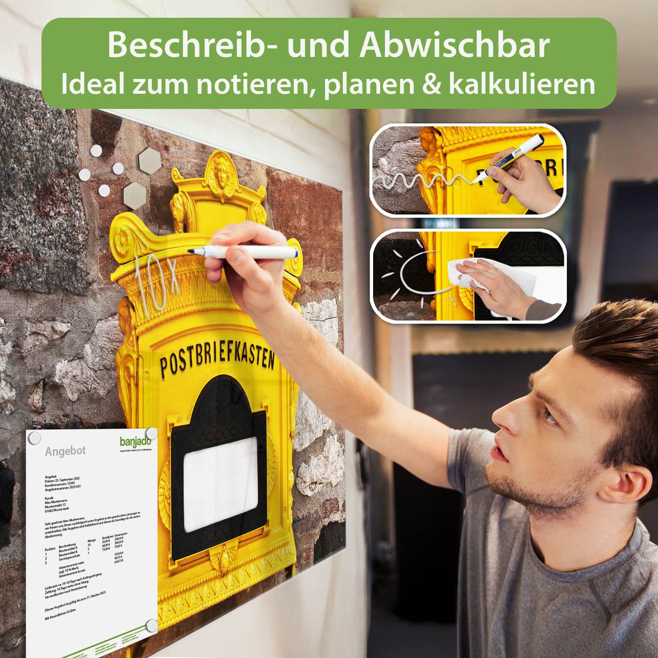 Material: 4mm Sicherheitsglas mit Metallrückwand Eigenschaften: beschreibbar, magnetisch, kratzfest Maße: 90x60x0,6cm, 8,10kg schwer Motiv Nummer 10337 Historischer Postkasten Zubehör: inklusive 4 Neodym-Magnete