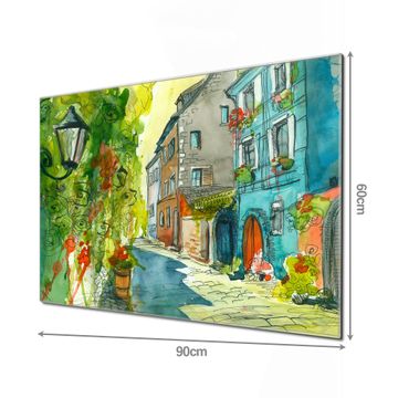 Material  4mm Sicherheitsglas mit Metallrückwand Eigenschaften  beschreibbar, magnetisch, kratzfest Maße  90x60x0,6cm, 8,10kg schwer Motiv  Nummer 11157 Historischer Stadtkern Zubehör  inklusive 4 Neodym-Magnete