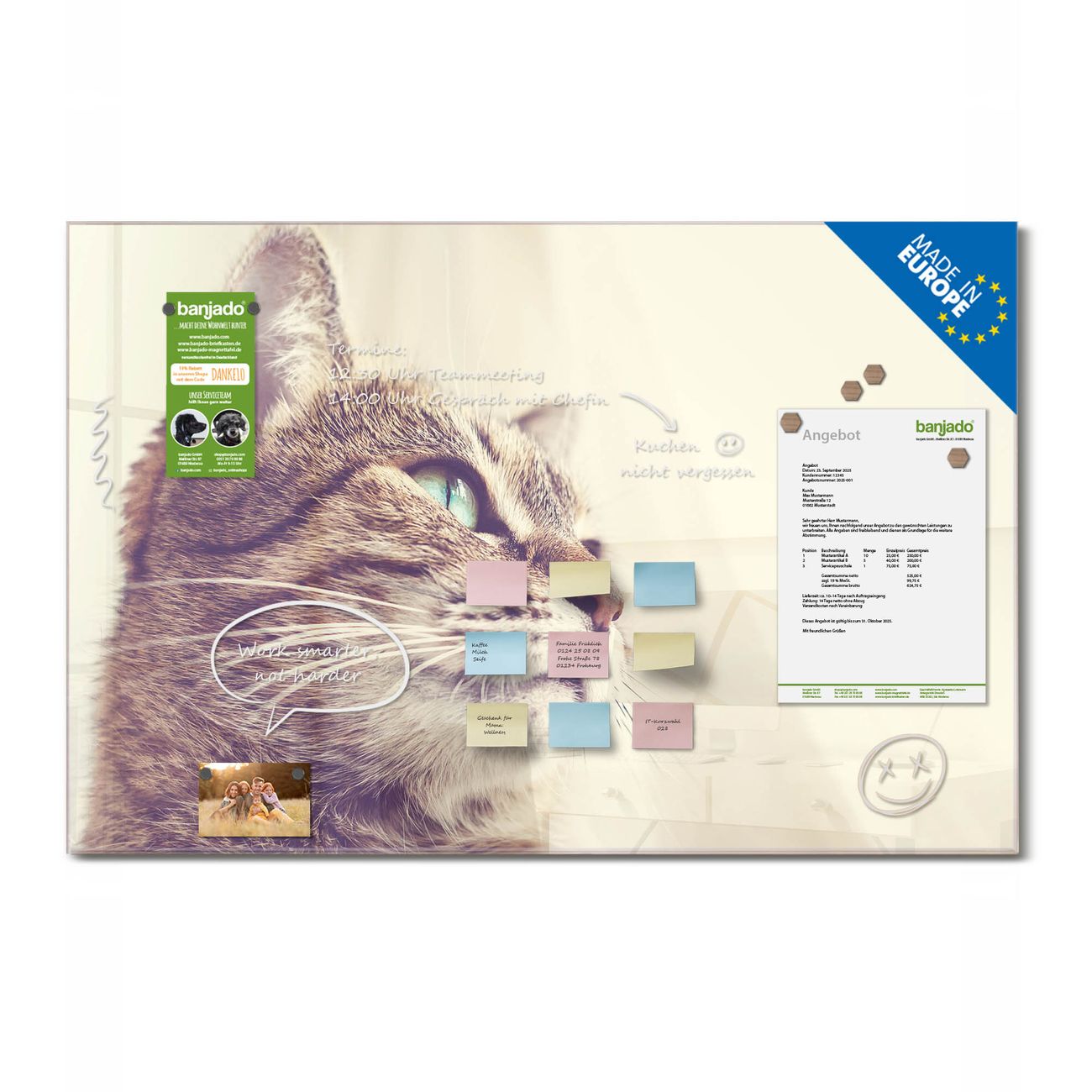 Jede Glas Magnettafel wird in unserer Werkstatt von Hand gefertigt und sorgfältig geprüft. So erhalten Sie ein echtes Qualitätsprodukt, das Funktion und Ästhetik perfekt vereint.?? Warum banjado?