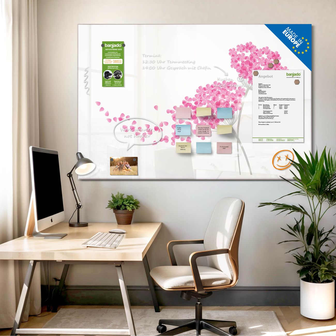 Die banjado Glas Magnettafel mit dem Motiv Motiv Holunder Pink verbindet Funktionalität mit Stil. Sie ersetzt das Zettelchaos durch klare Strukturen und bringt dabei eine warme, natürliche Atmosphäre in Ihr Zuhause. Ob im Büro, in der Küche oder im Eingangsbereich - dieses Design-Board zieht Blicke an und sorgt für Ordnung mit Charakter.