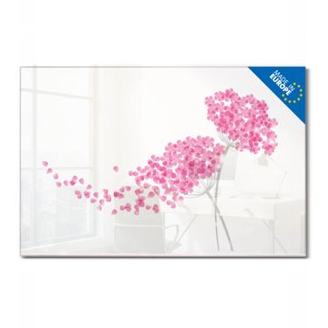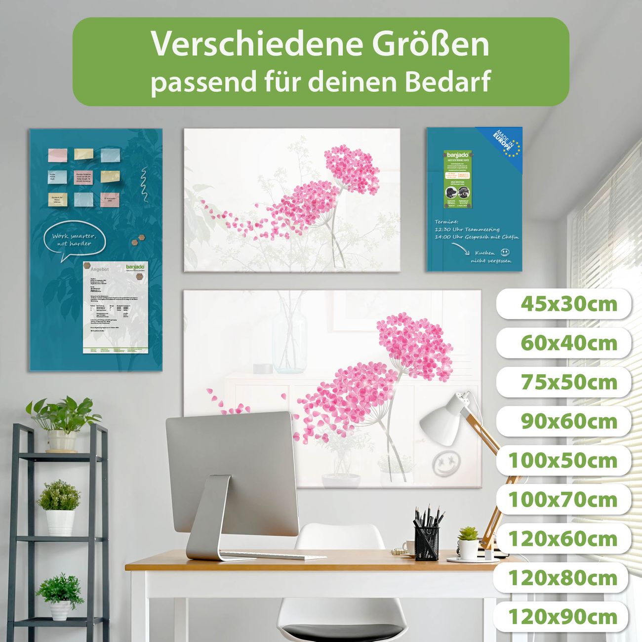 Material: 4mm Sicherheitsglas mit Metallrückwand Eigenschaften: beschreibbar, magnetisch, kratzfest Maße: 120x80x0,6cm, 14,40kg schwer Motiv Nummer 11242 Holunder Pink Zubehör: inklusive 4 Neodym-Magnete