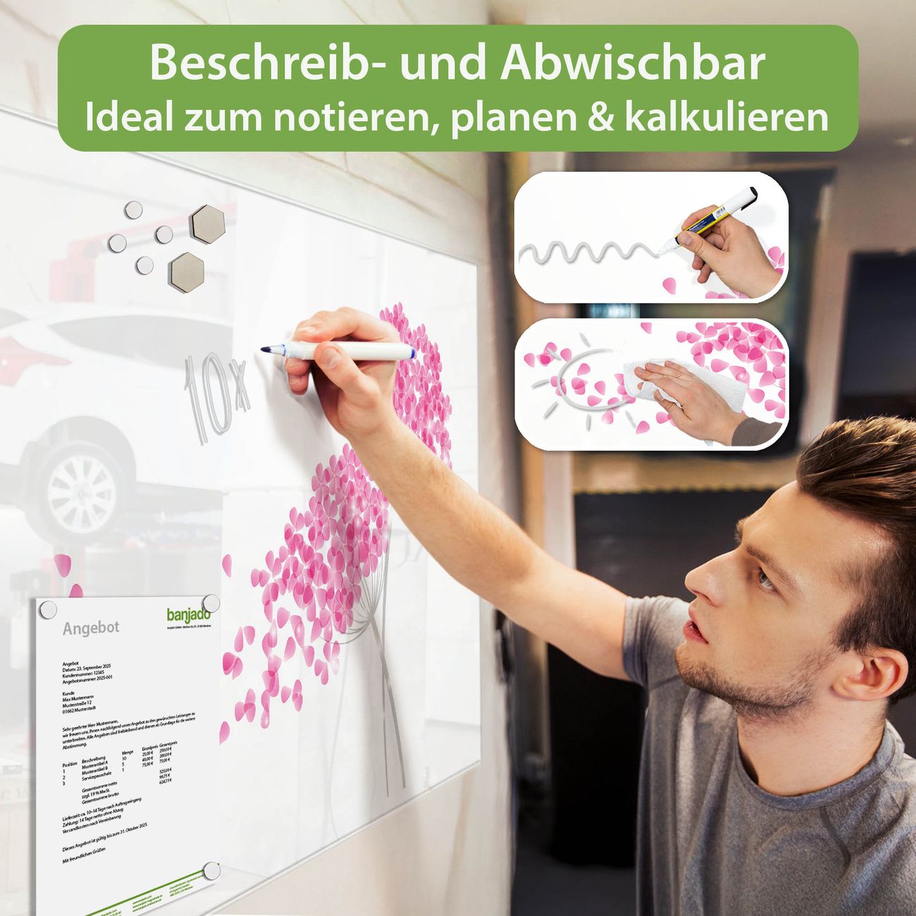 Bitte beachten Sie, dass ausschliessliche spezielle Magnete an der Glastafel haften. Wir empfehlen banjado Neodym Magnete, diese sind durch uns auf Wirksamkeit geprüft.
