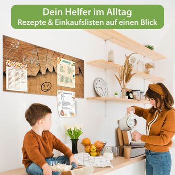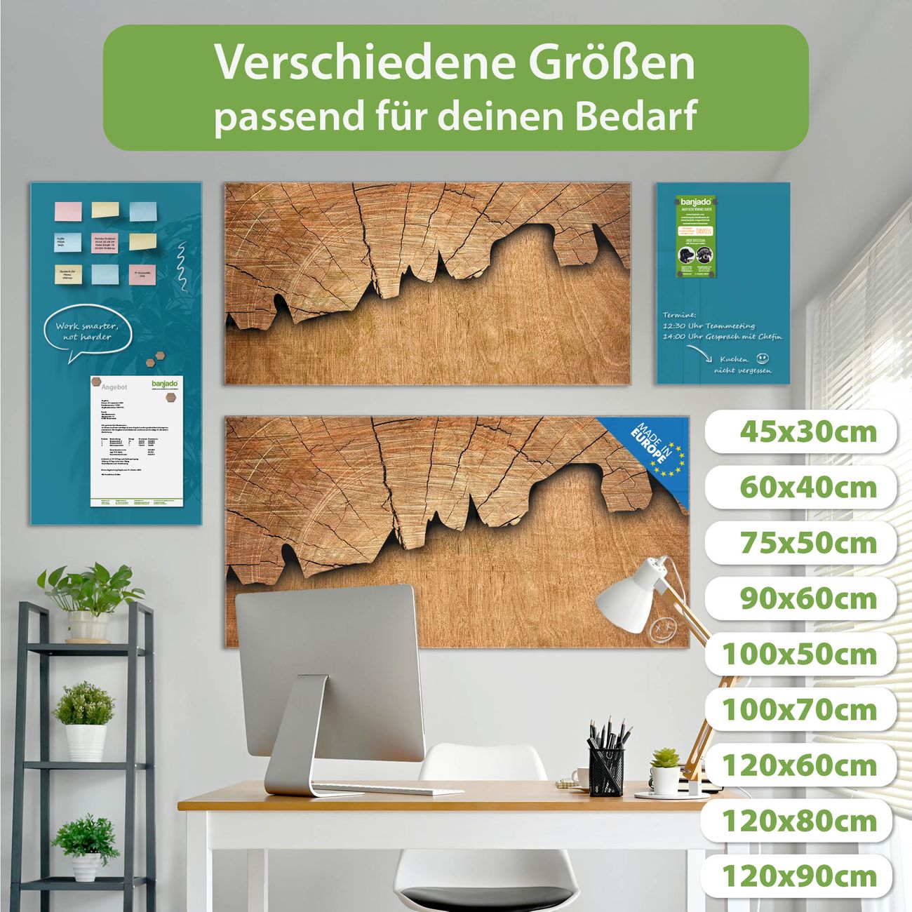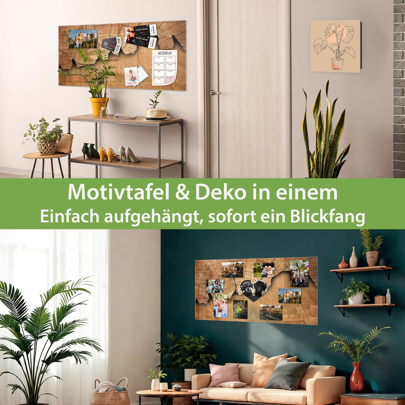 Material: 4mm Sicherheitsglas mit Metallrückwand Eigenschaften: beschreibbar, magnetisch, kratzfest Maße: 100x50x0,6cm, 7,50kg schwer Motiv Nummer 10447 Holz Zubehör: inklusive 4 Neodym-Magnete