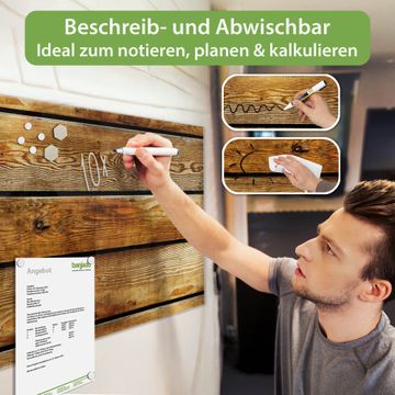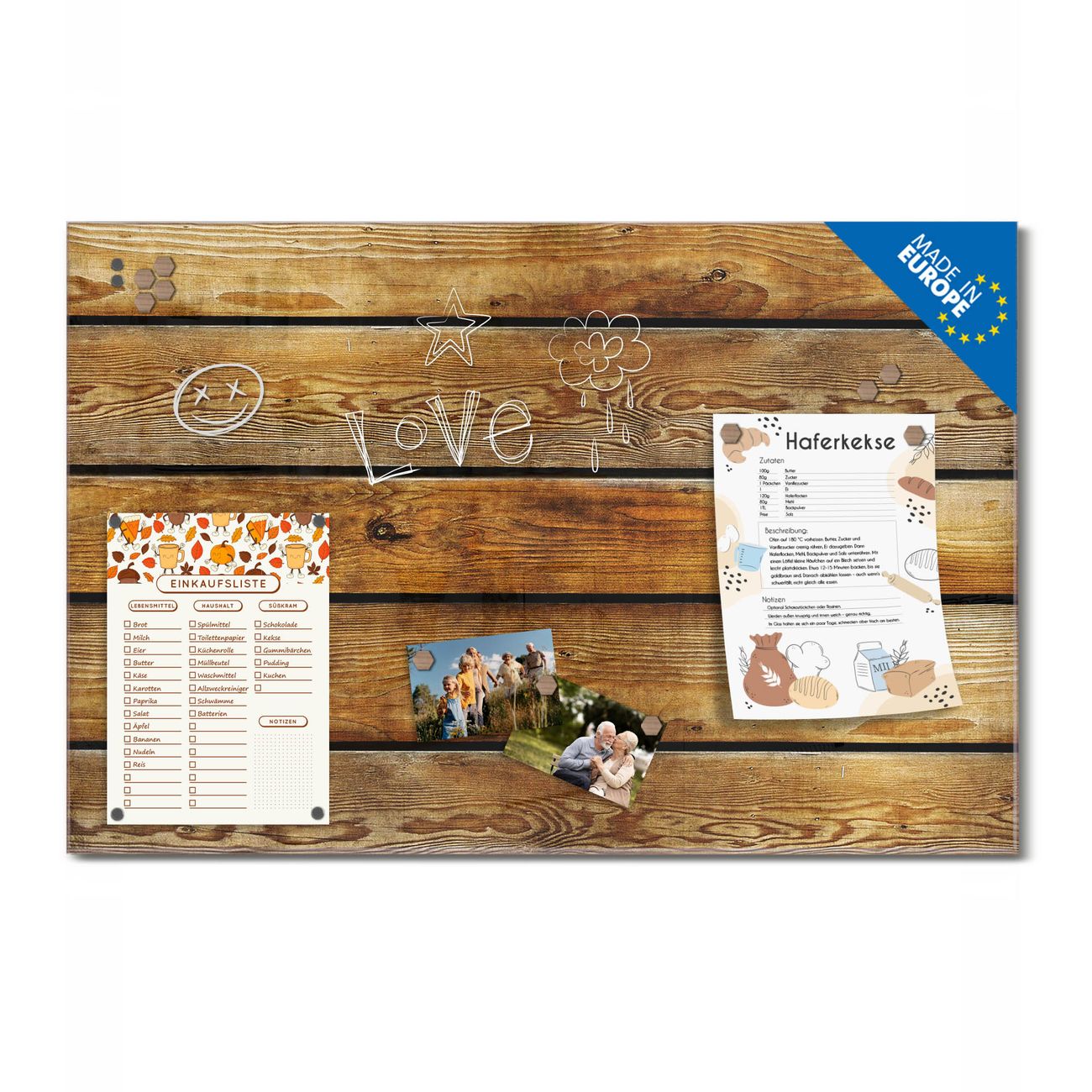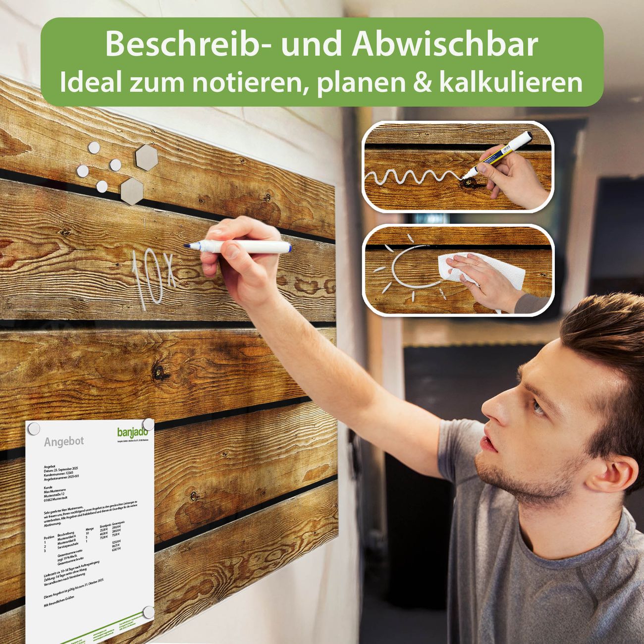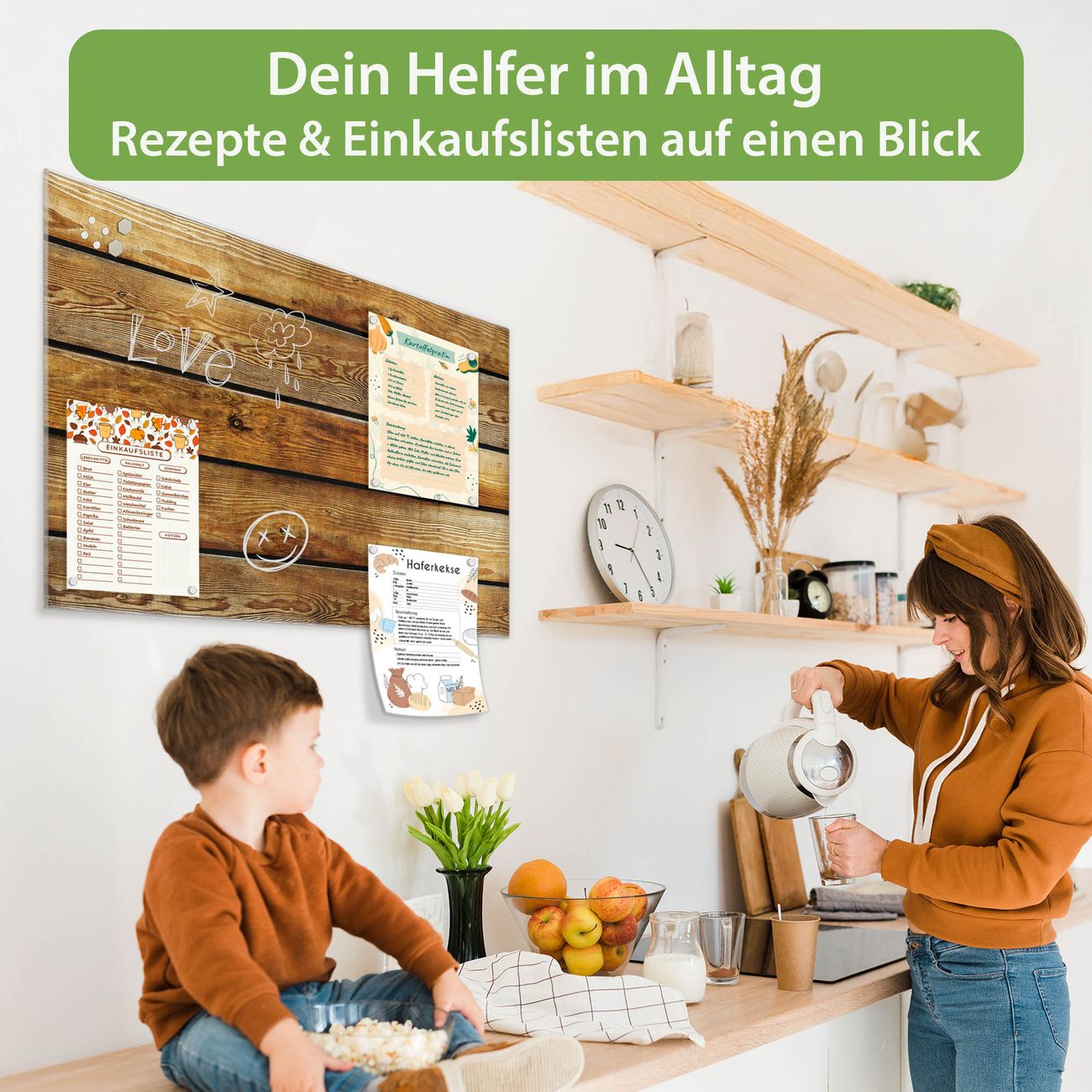 Ein Stück Design, das Ihren Alltag organisiert. Schreiben, heften, inspirieren - alles an einem Ort. Qualität, die man spürt. Montage leicht gemacht. Handwerk mit Herz - veredelt in Sachsen. Einzigartiges Design mit Motiv Motiv Holzbretter Beschreibbare Glasoberfläche, leicht zu reinigen Starke Magnetkraft durch Stahlrückwand Inklusive 4 Neodym-Magneten Flexible Montageoptionen Handveredelt in Sachsen - Qualität, die bleibt