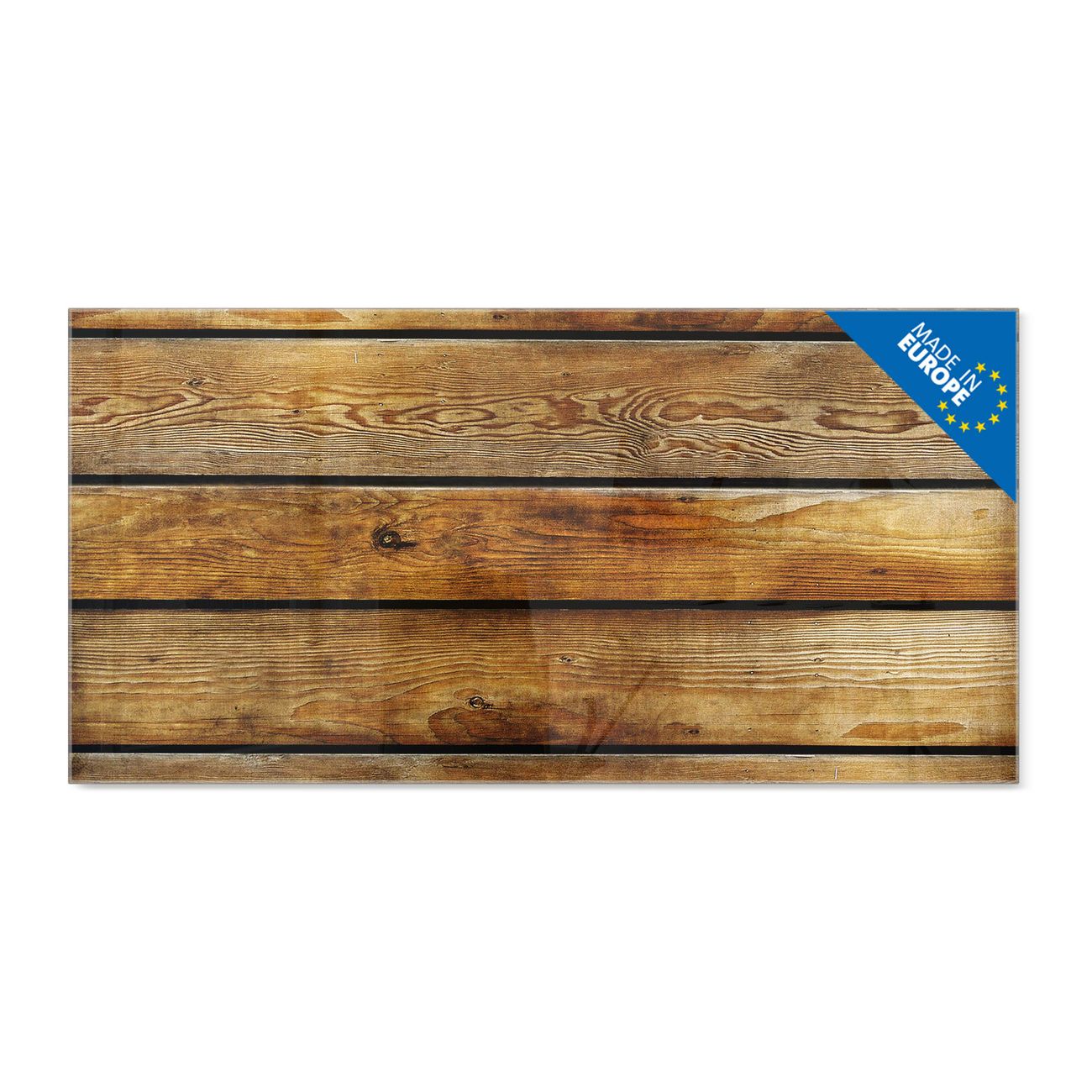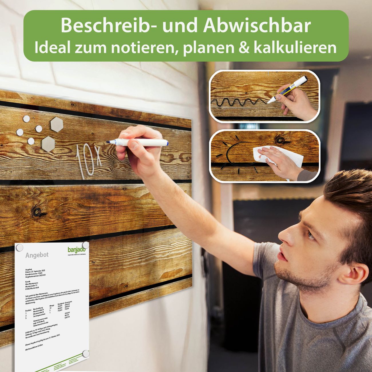 Material: 4mm Sicherheitsglas mit Metallrückwand Eigenschaften: beschreibbar, magnetisch, kratzfest Maße: 120x80x0,6cm, 14,40kg schwer Motiv Nummer 10056 Holzbretter Zubehör: inklusive 4 Neodym-Magnete