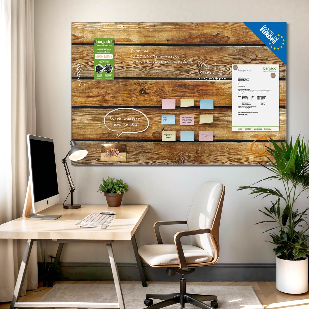 Jede Glas Magnettafel wird in unserer Werkstatt von Hand gefertigt und sorgfältig geprüft. So erhalten Sie ein echtes Qualitätsprodukt, das Funktion und Ästhetik perfekt vereint.?? Warum banjado?