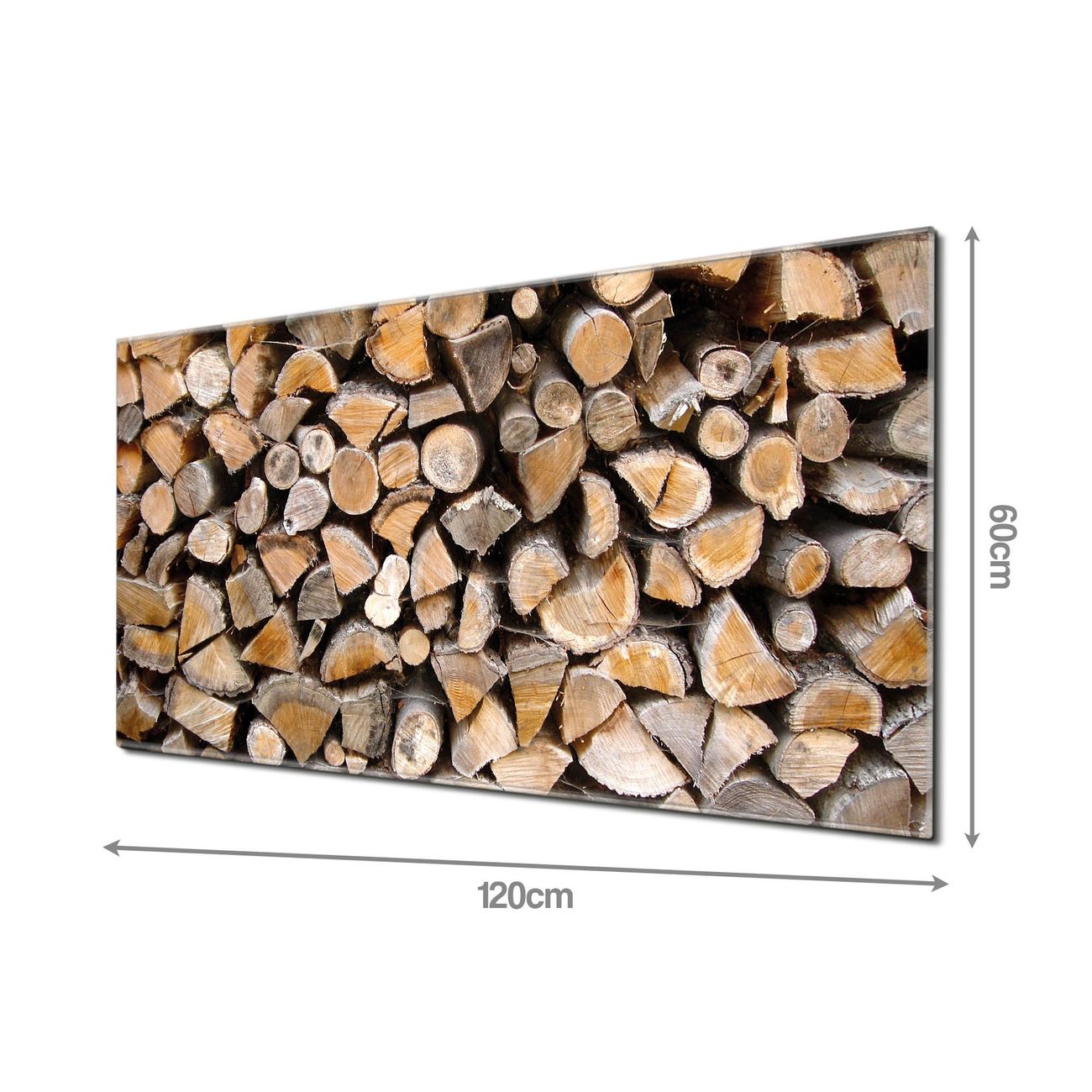 Material: 4mm Sicherheitsglas mit Metallrückwand Eigenschaften: beschreibbar, magnetisch, kratzfest Maße: 120x60x0,6cm, 10,80kg schwer Motiv Nummer 10141 Holzstapel Zubehör: inklusive 4 Neodym-Magnete