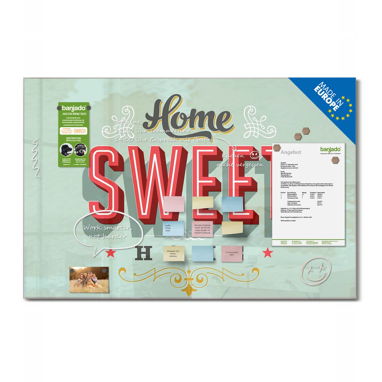 Material: 4mm Sicherheitsglas mit Metallrückwand Eigenschaften: beschreibbar, magnetisch, kratzfest Maße: 120x80x0,6cm, 14,40kg schwer Motiv Nummer 10732 Home Sweet Home Zubehör: inklusive 4 Neodym-Magnete