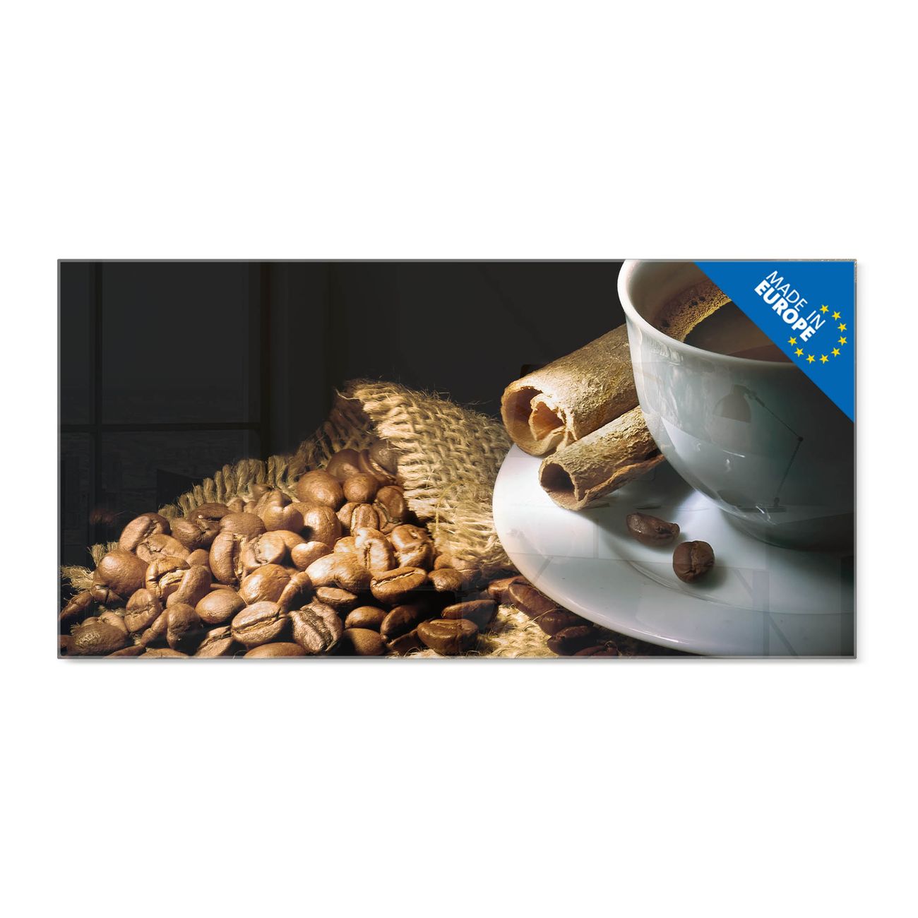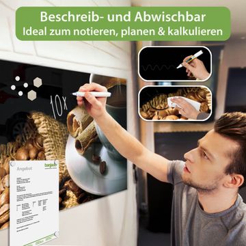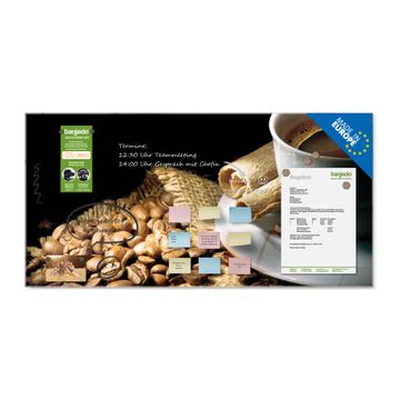 Material: 4mm Sicherheitsglas mit Metallrückwand Eigenschaften: beschreibbar, magnetisch, kratzfest Maße: 100x50x0,6cm, 7,50kg schwer Motiv Nummer 10176 Hot Coffee Zubehör: inklusive 4 Neodym-Magnete
