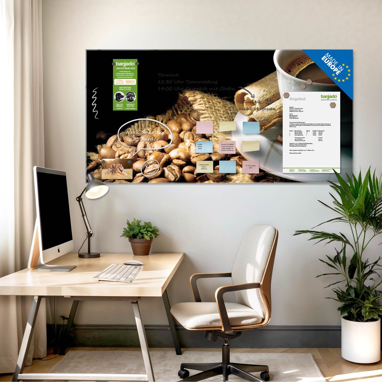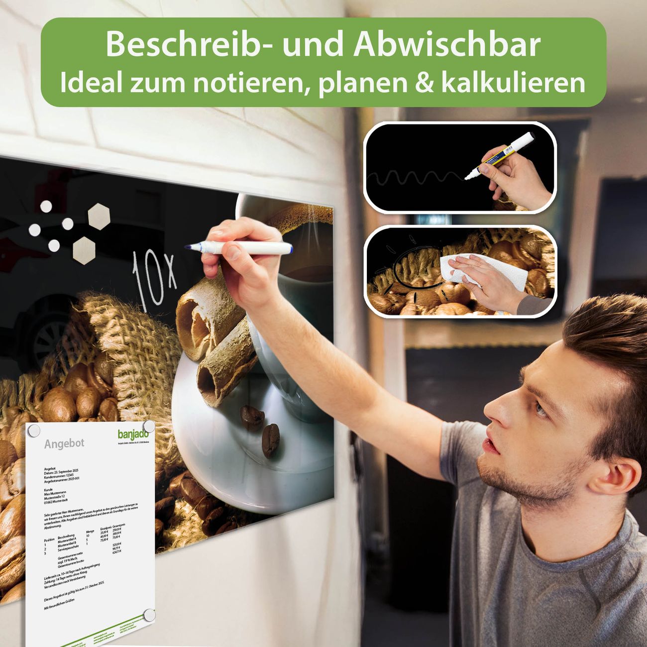Jede Glas Magnettafel wird in unserer Werkstatt von Hand gefertigt und sorgfältig geprüft. So erhalten Sie ein echtes Qualitätsprodukt, das Funktion und Ästhetik perfekt vereint.?? Warum banjado?