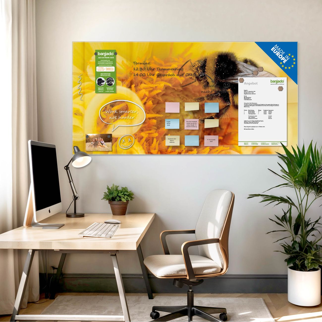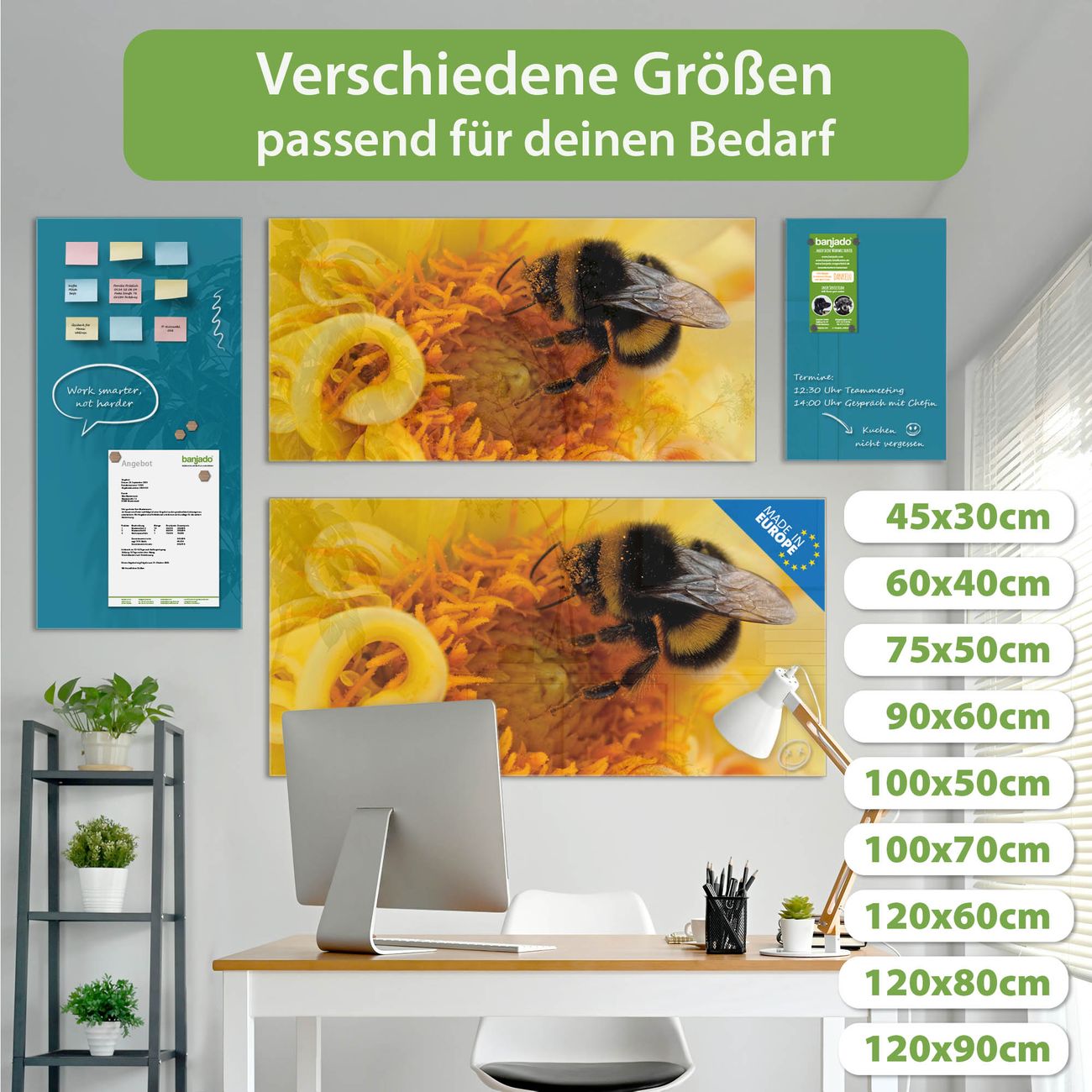 Jede Glas Magnettafel wird in unserer Werkstatt von Hand gefertigt und sorgfältig geprüft. So erhalten Sie ein echtes Qualitätsprodukt, das Funktion und Ästhetik perfekt vereint.?? Warum banjado?