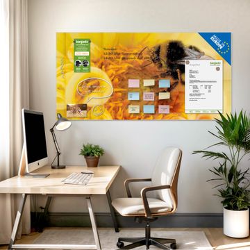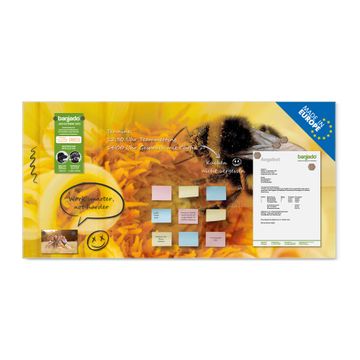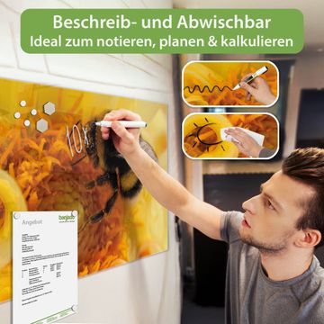 Material: 4mm Sicherheitsglas mit Metallrückwand Eigenschaften: beschreibbar, magnetisch, kratzfest Maße: 100x50x0,6cm, 7,50kg schwer Motiv Nummer 10465 Hummel Zubehör: inklusive 4 Neodym-Magnete