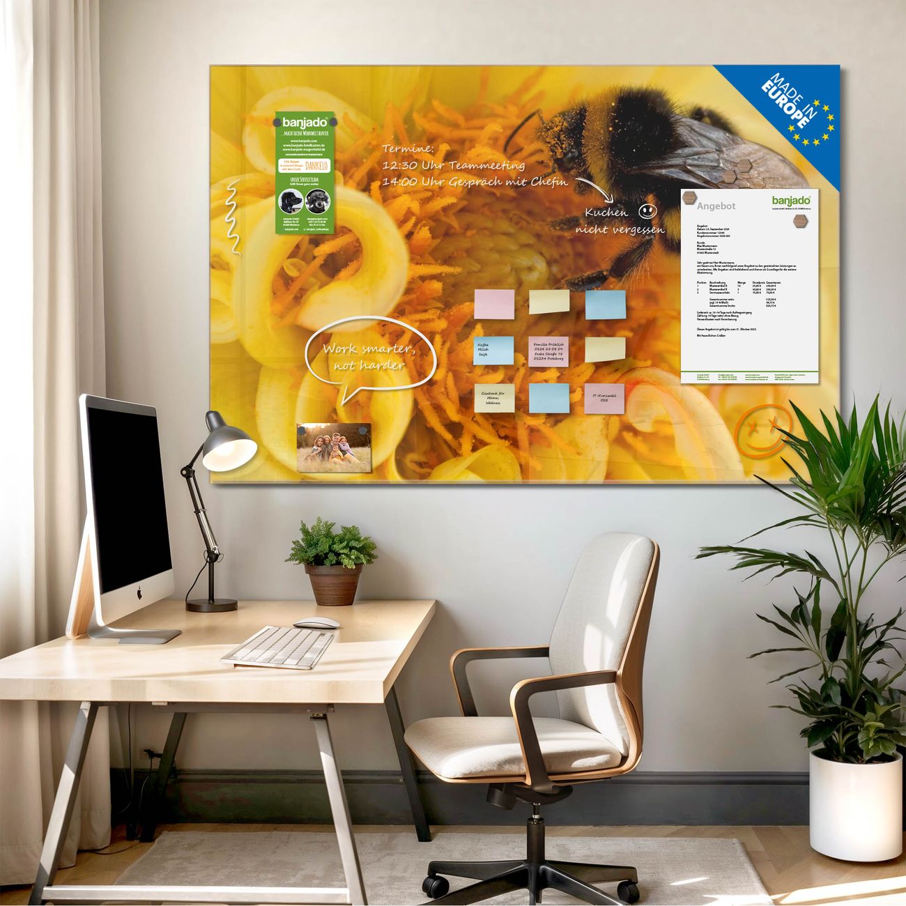 Die banjado Glas Magnettafel mit dem Motiv Motiv Hummel verbindet Funktionalität mit Stil. Sie ersetzt das Zettelchaos durch klare Strukturen und bringt dabei eine warme, natürliche Atmosphäre in Ihr Zuhause. Ob im Büro, in der Küche oder im Eingangsbereich - dieses Design-Board zieht Blicke an und sorgt für Ordnung mit Charakter.