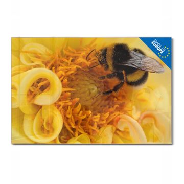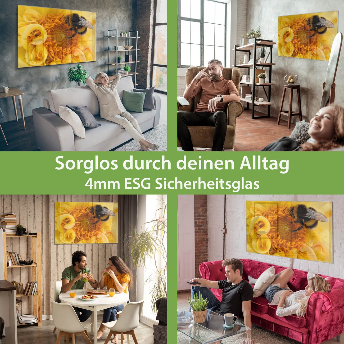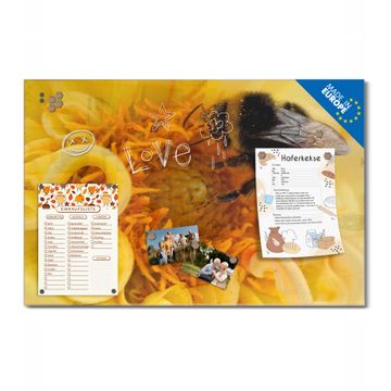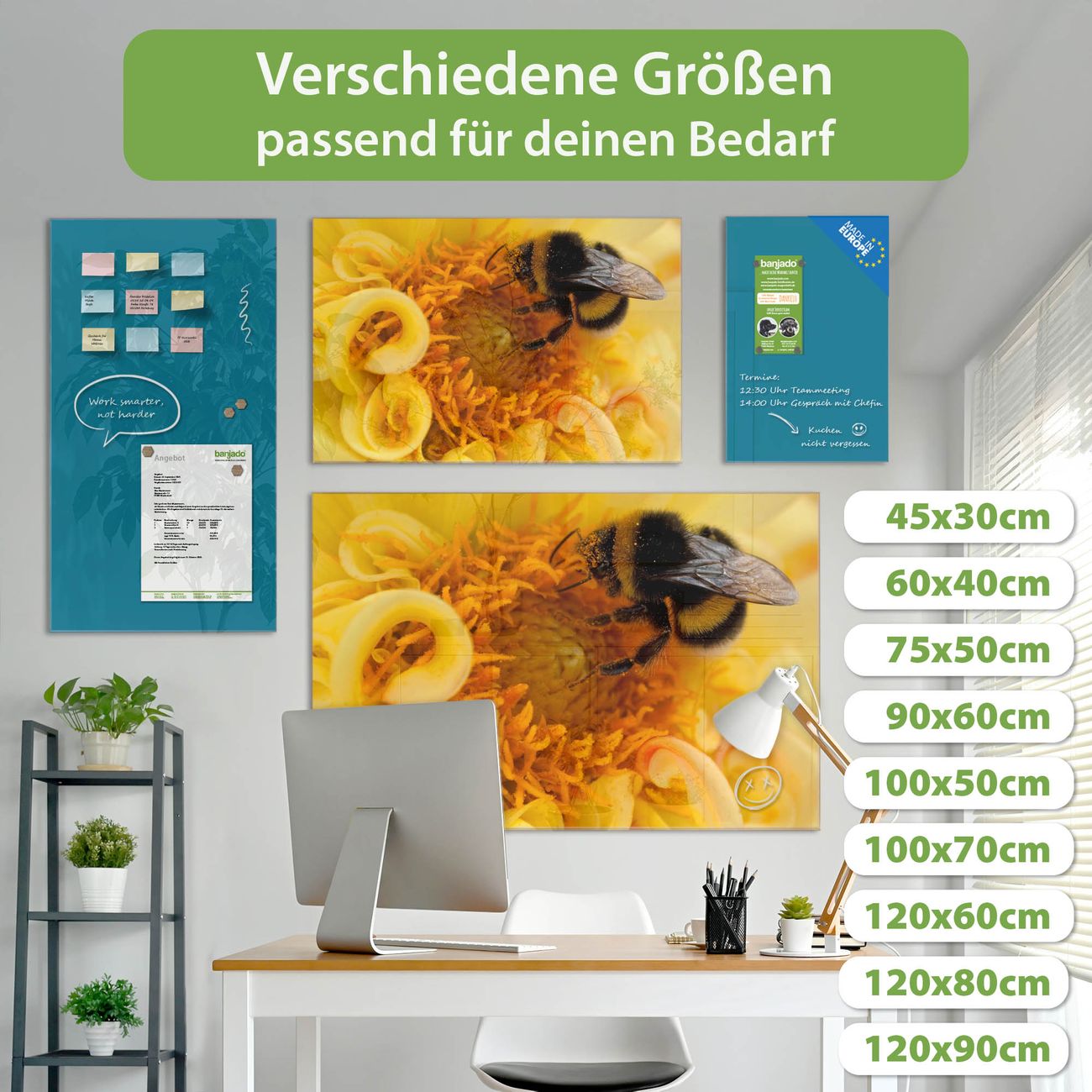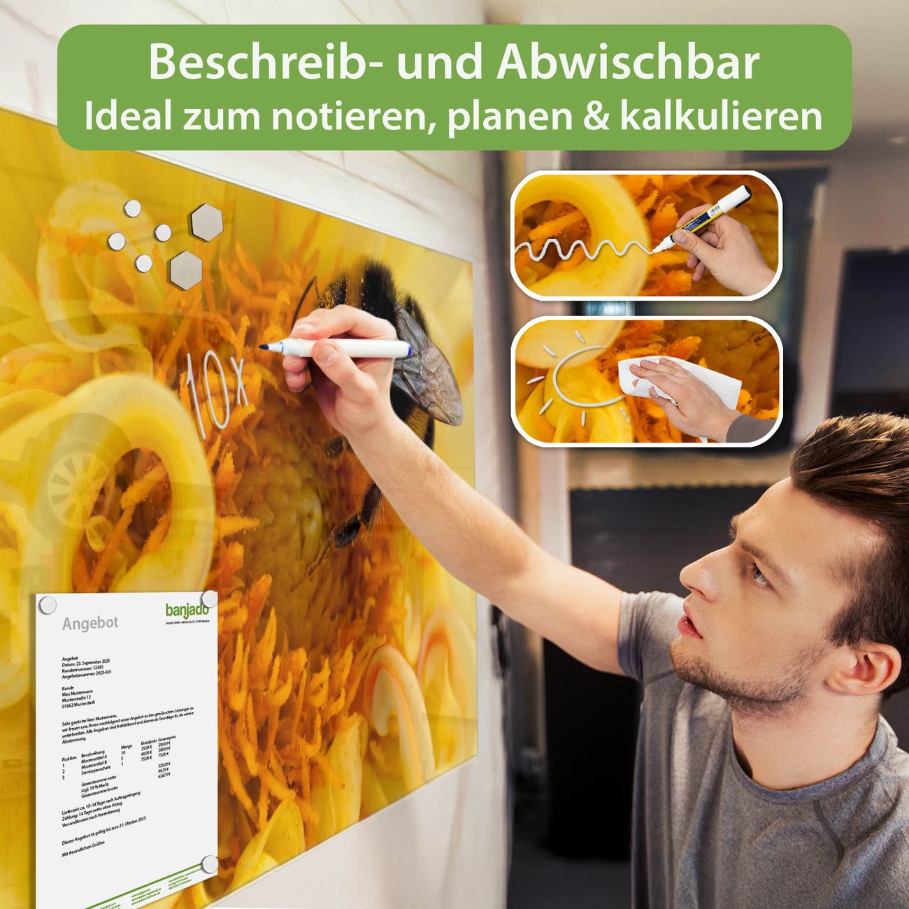 Material: 4mm Sicherheitsglas mit Metallrückwand Eigenschaften: beschreibbar, magnetisch, kratzfest Maße: 75x50x0,6cm, 5,63kg schwer Motiv Nummer 10465 Hummel Zubehör: inklusive 4 Neodym-Magnete