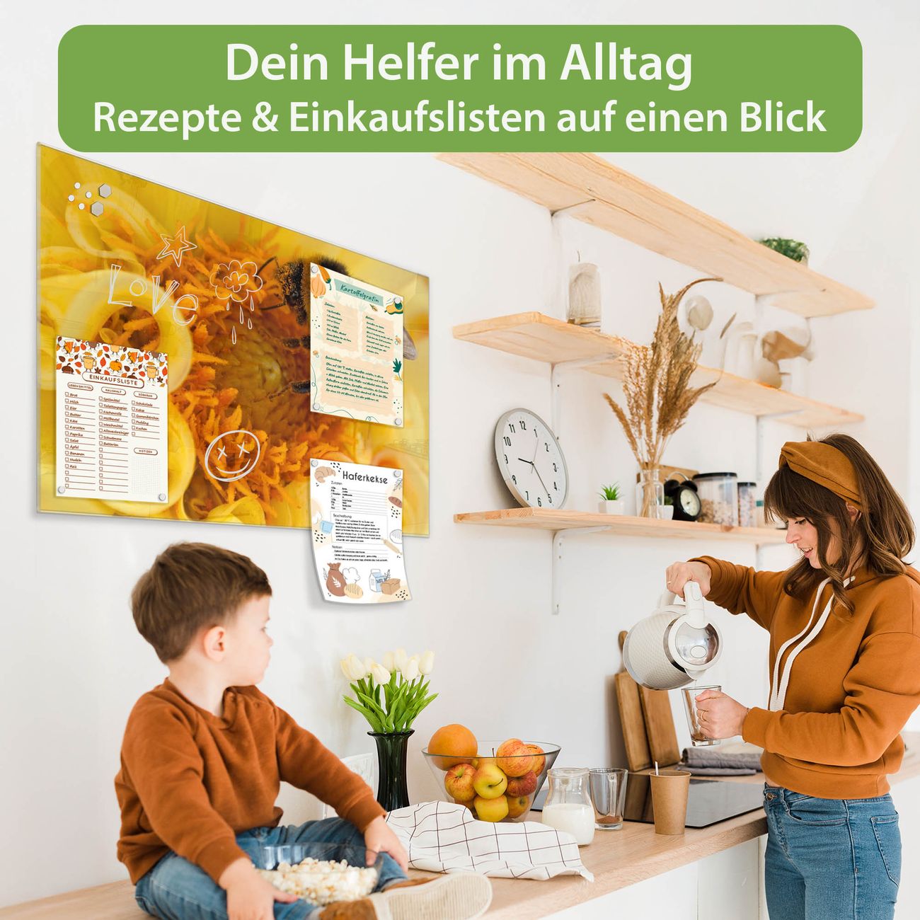 Auf der glatten Glasoberfläche lassen sich Termine, Rezepte oder Notizen ganz einfach mit Kreidestiften festhalten und rückstandslos entfernen. Starke Neodym-Magnete halten Ihre wichtigsten Erinnerungen sicher an Ort und Stelle. So entsteht Ihre ganz persönliche Ideenwand - jeden Tag neu.