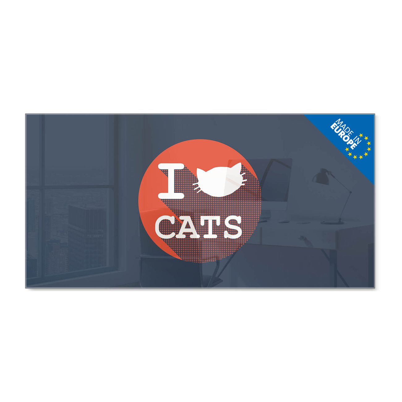 Material: 4mm Sicherheitsglas mit Metallrückwand Eigenschaften: beschreibbar, magnetisch, kratzfest Maße: 100x50x0,6cm, 7,50kg schwer Motiv Nummer 12134 I Love Cats Zubehör: inklusive 4 Neodym-Magnete