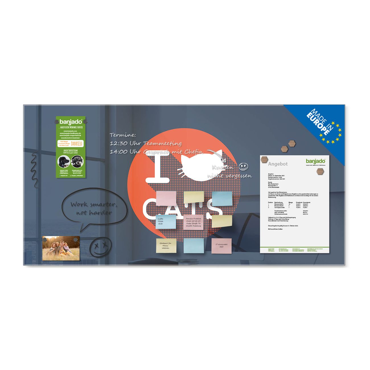 Jede Glas Magnettafel wird in unserer Werkstatt von Hand gefertigt und sorgfältig geprüft. So erhalten Sie ein echtes Qualitätsprodukt, das Funktion und Ästhetik perfekt vereint.?? Warum banjado?