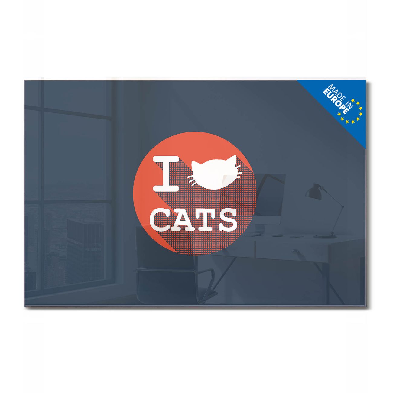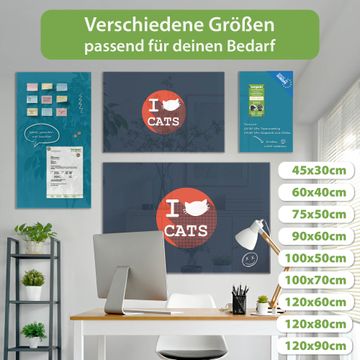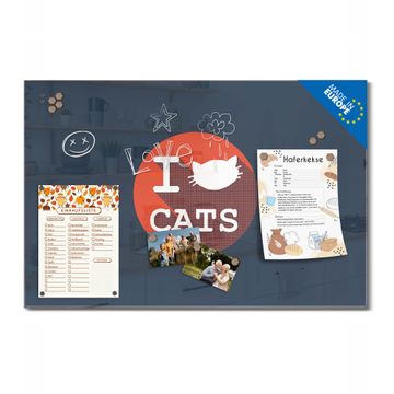 Material: 4mm Sicherheitsglas mit Metallrückwand Eigenschaften: beschreibbar, magnetisch, kratzfest Maße: 75x50x0,6cm, 5,63kg schwer Motiv Nummer 12134 I Love Cats Zubehör: inklusive 4 Neodym-Magnete