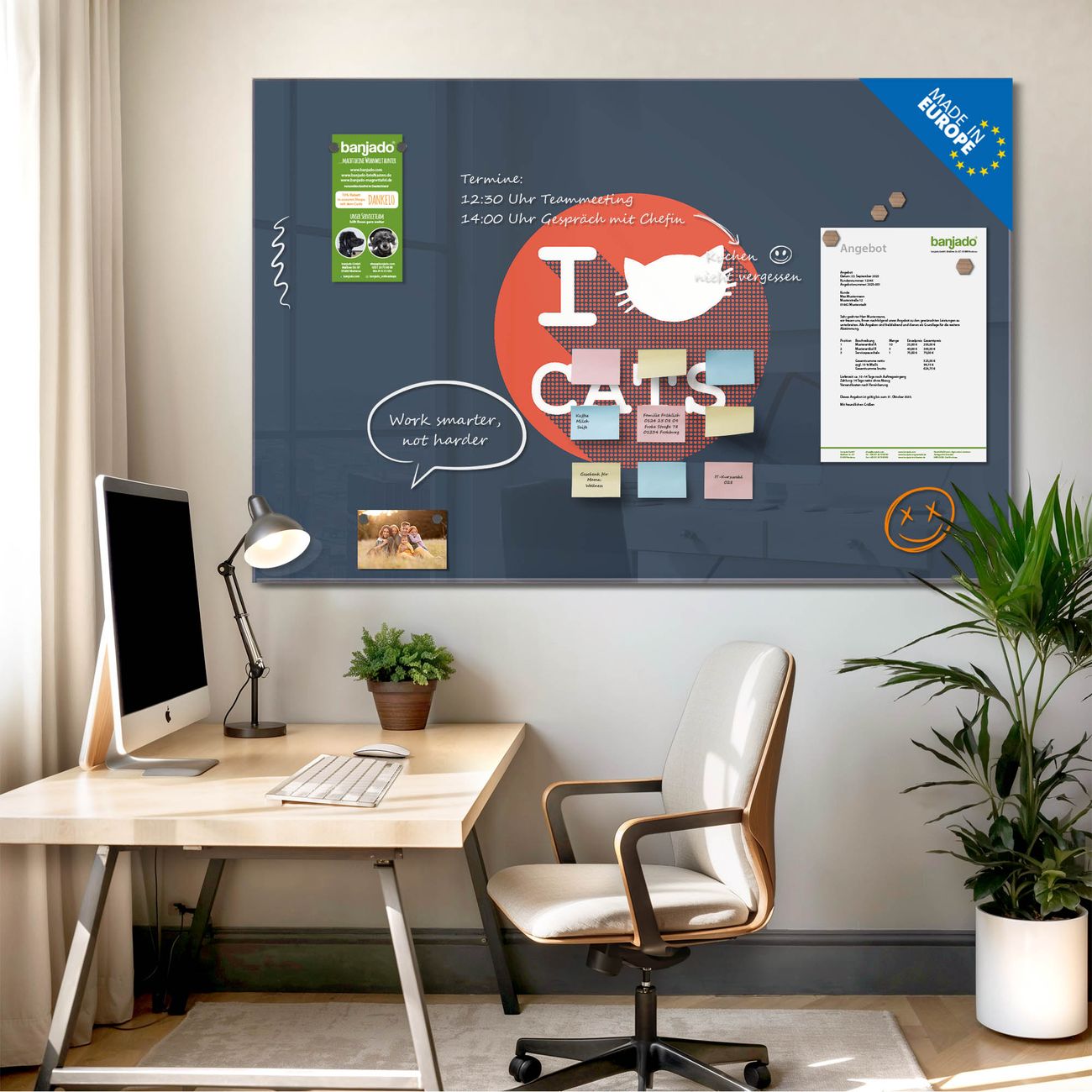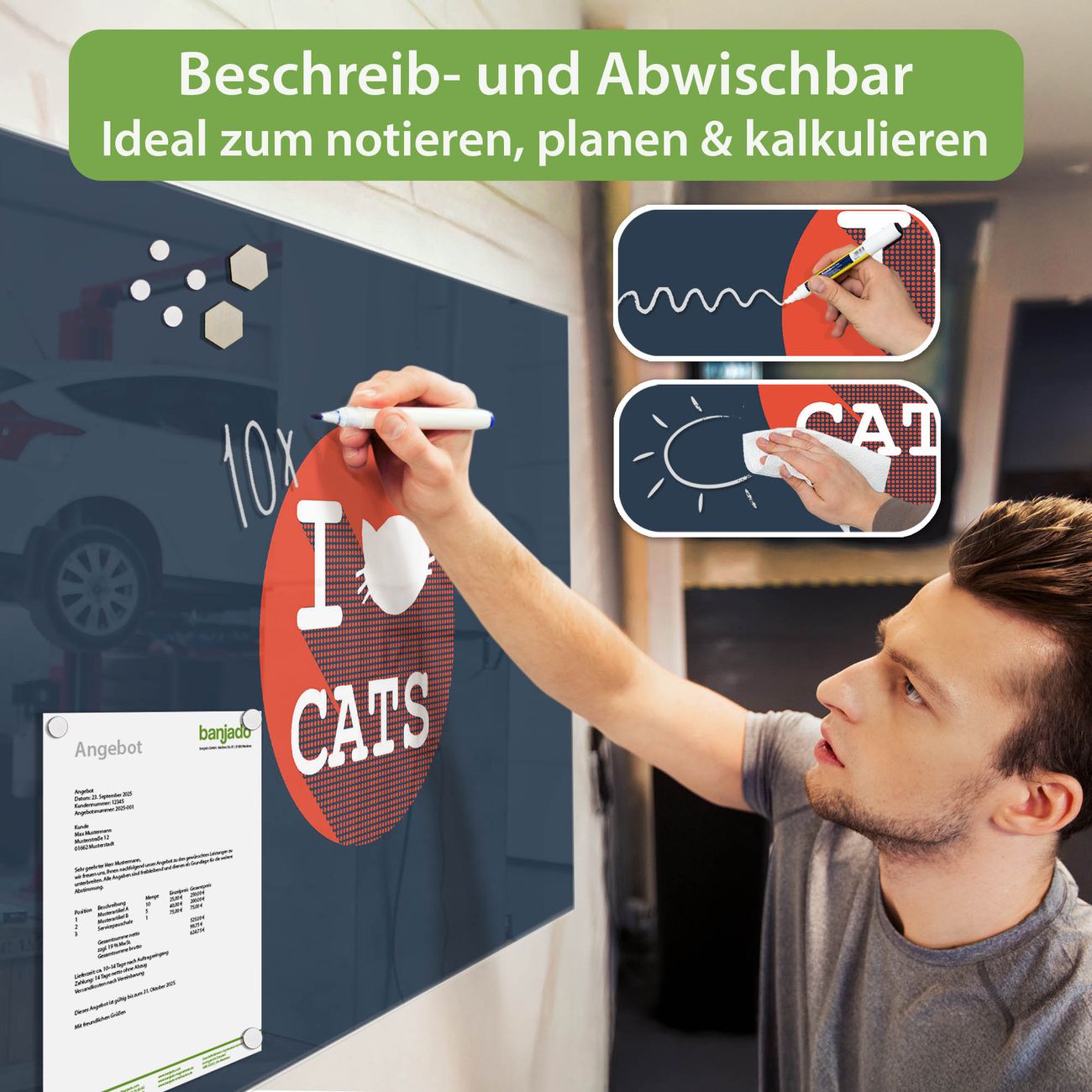 Jede Glas Magnettafel wird in unserer Werkstatt von Hand gefertigt und sorgfältig geprüft. So erhalten Sie ein echtes Qualitätsprodukt, das Funktion und Ästhetik perfekt vereint.?? Warum banjado?
