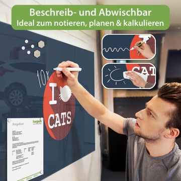 Auf der glatten Glasoberfläche lassen sich Termine, Rezepte oder Notizen ganz einfach mit Kreidestiften festhalten und rückstandslos entfernen. Starke Neodym-Magnete halten Ihre wichtigsten Erinnerungen sicher an Ort und Stelle. So entsteht Ihre ganz persönliche Ideenwand - jeden Tag neu.