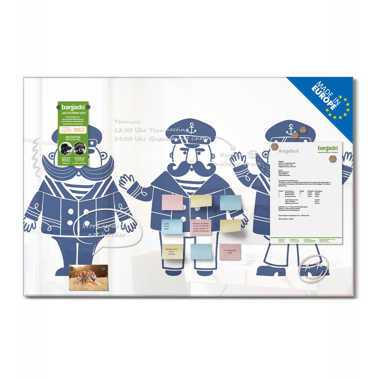 Material: 4mm Sicherheitsglas mit Metallrückwand Eigenschaften: beschreibbar, magnetisch, kratzfest Maße: 90x60x0,6cm, 8,10kg schwer Motiv Nummer 11055 I Love Sea Zubehör: inklusive 4 Neodym-Magnete