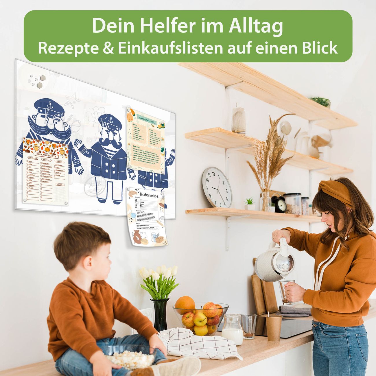 Auf der glatten Glasoberfläche lassen sich Termine, Rezepte oder Notizen ganz einfach mit Kreidestiften festhalten und rückstandslos entfernen. Starke Neodym-Magnete halten Ihre wichtigsten Erinnerungen sicher an Ort und Stelle. So entsteht Ihre ganz persönliche Ideenwand - jeden Tag neu.