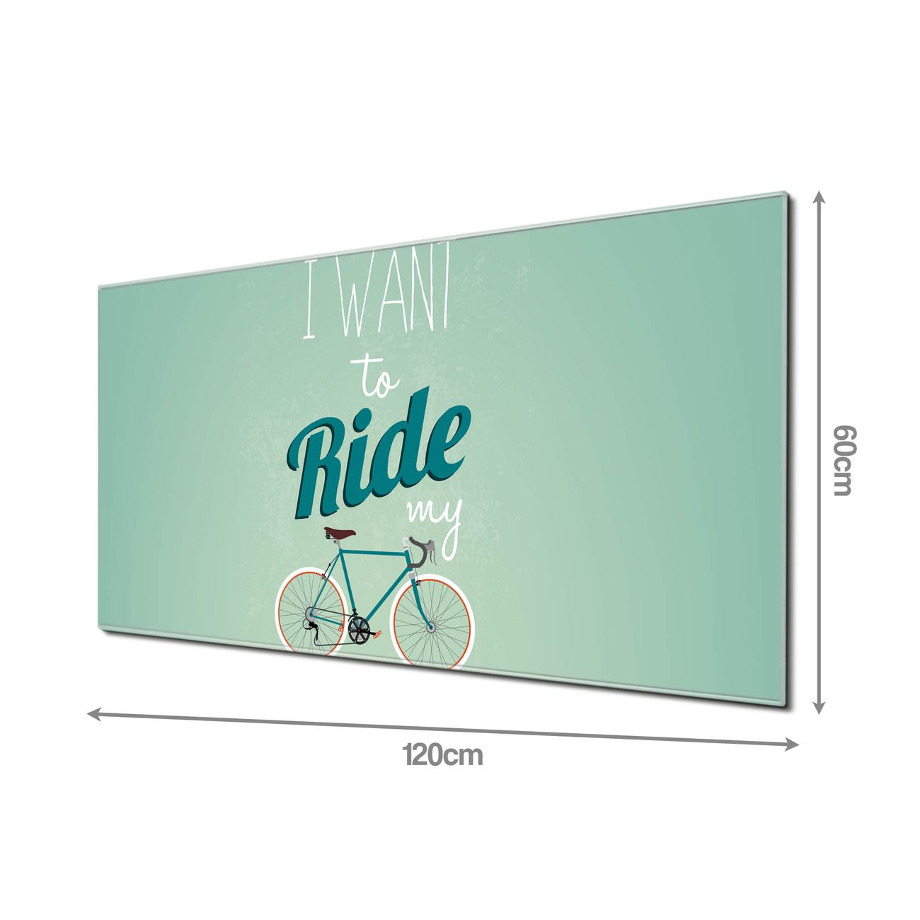 Material: 4mm Sicherheitsglas mit Metallrückwand Eigenschaften: beschreibbar, magnetisch, kratzfest Maße: 120x60x0,6cm, 10,80kg schwer Motiv Nummer 10638 I want to ride my bike Zubehör: inklusive 4 Neodym-Magnete