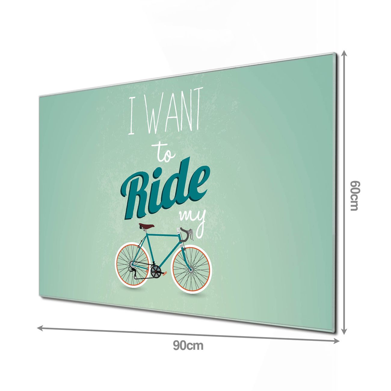 Material: 4mm Sicherheitsglas mit Metallrückwand Eigenschaften: beschreibbar, magnetisch, kratzfest Maße: 90x60x0,6cm, 8,10kg schwer Motiv Nummer 10638 I want to ride my bike Zubehör: inklusive 4 Neodym-Magnete