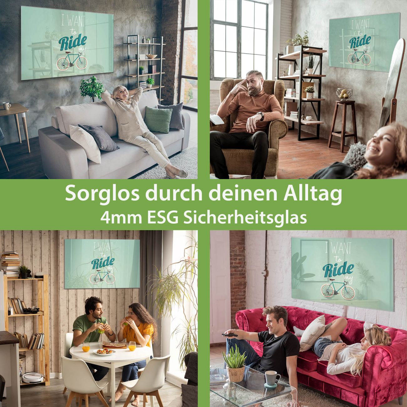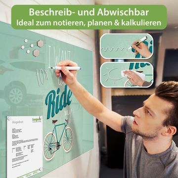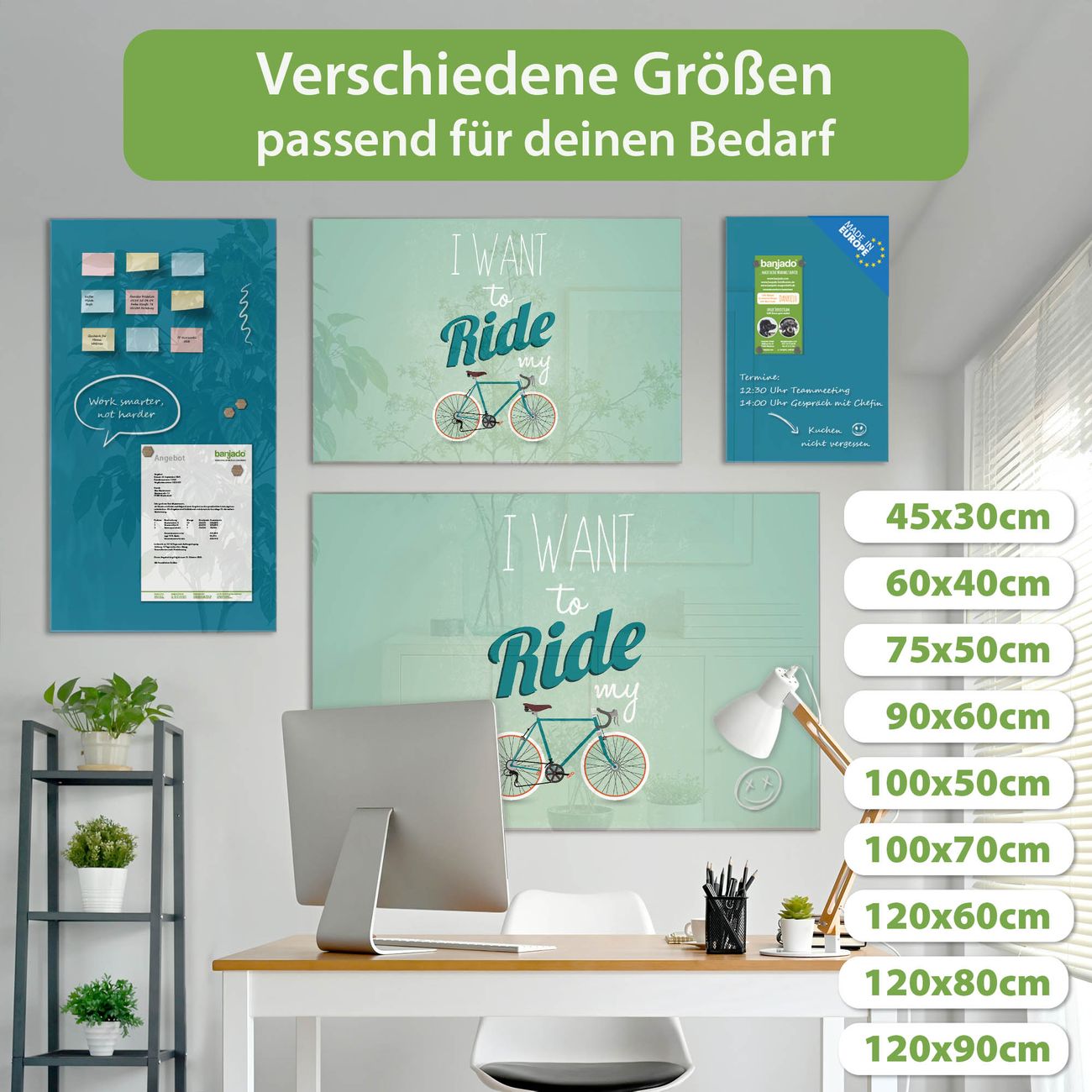 Material: 4mm Sicherheitsglas mit Metallrückwand Eigenschaften: beschreibbar, magnetisch, kratzfest Maße: 45x30x0,6cm, 2,03kg schwer Motiv Nummer 10638 I want to ride my bike Zubehör: inklusive 4 Neodym-Magnete