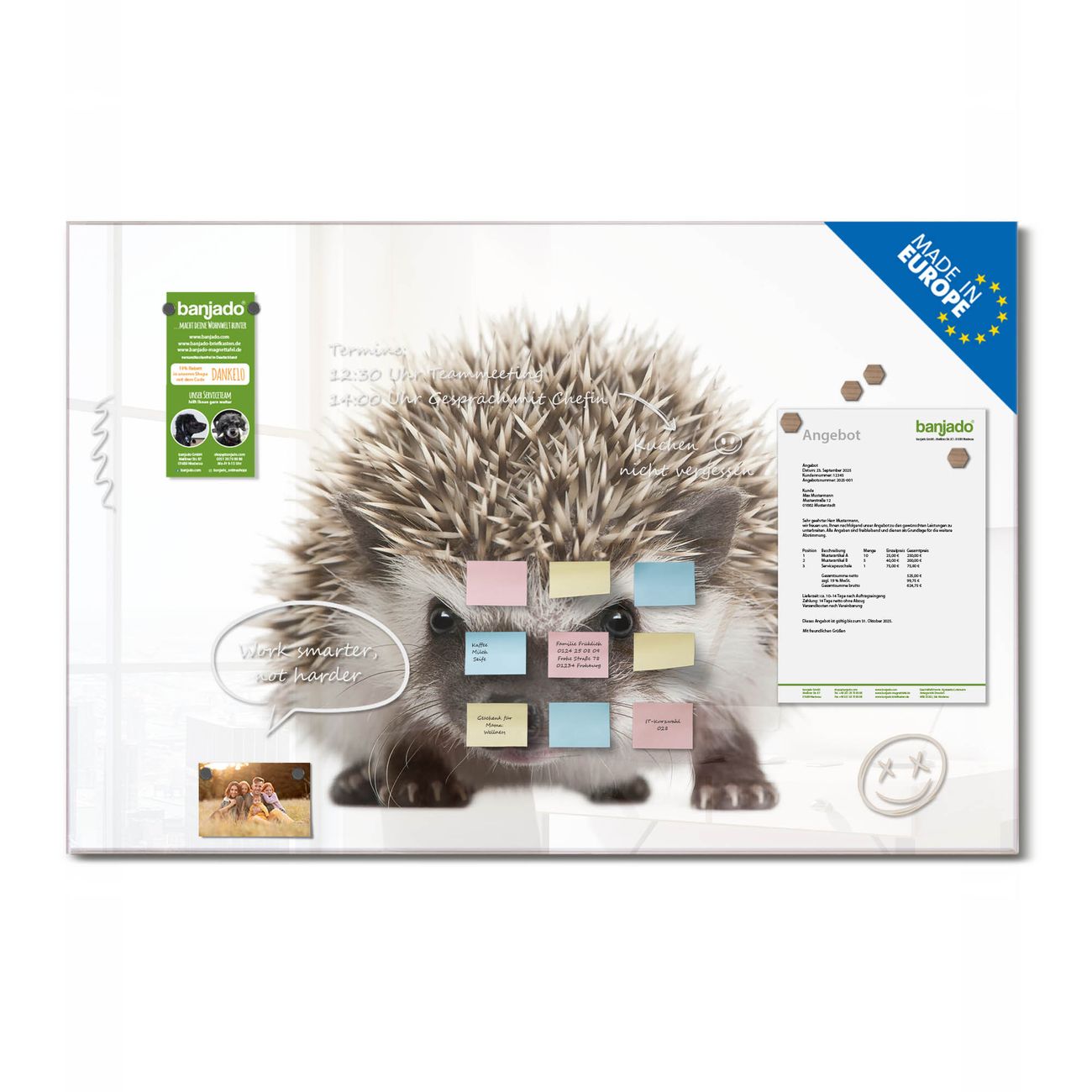 Material: 4mm Sicherheitsglas mit Metallrückwand Eigenschaften: beschreibbar, magnetisch, kratzfest Maße: 120x80x0,6cm, 14,40kg schwer Motiv Nummer 10202 Igel Zubehör: inklusive 4 Neodym-Magnete