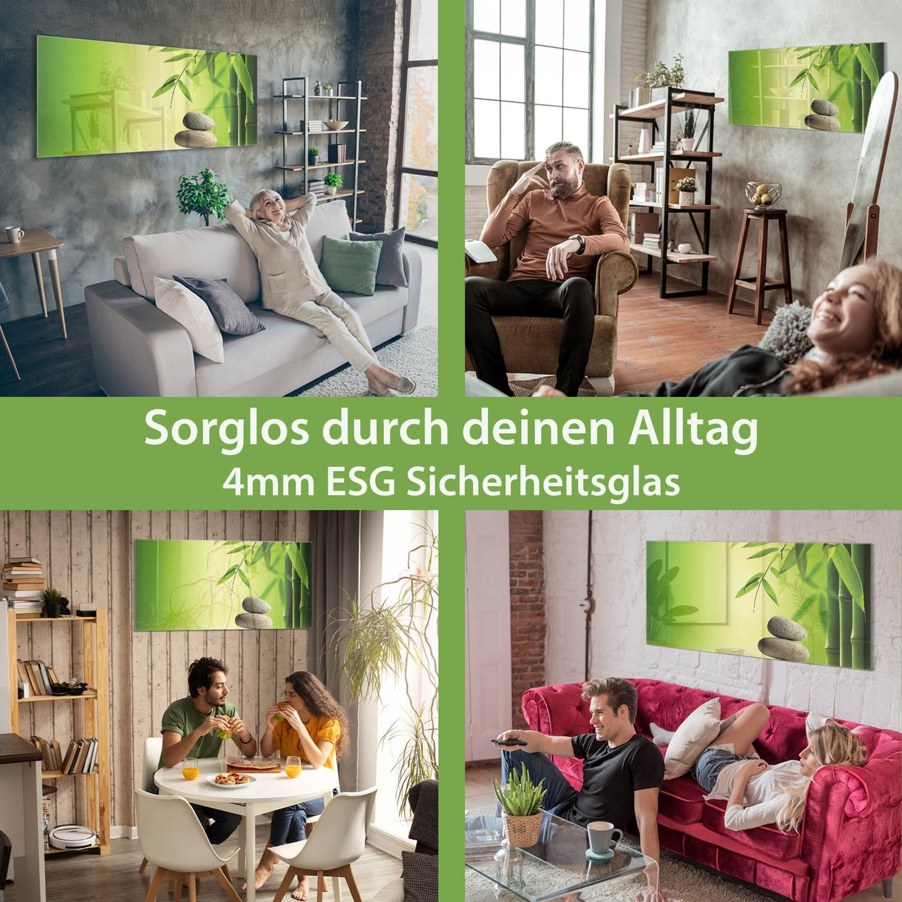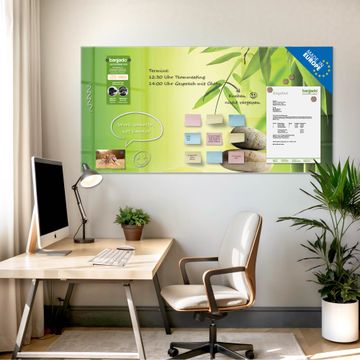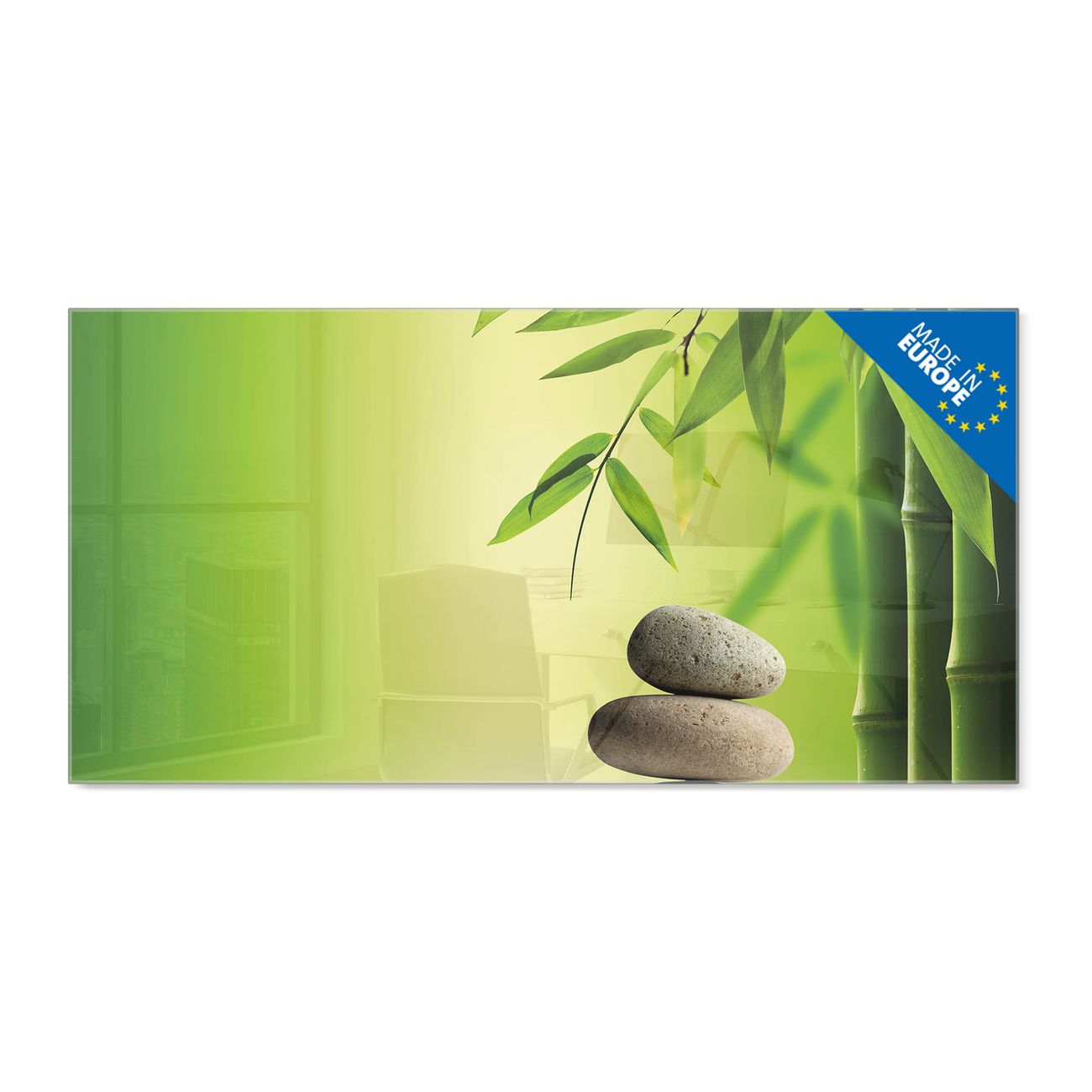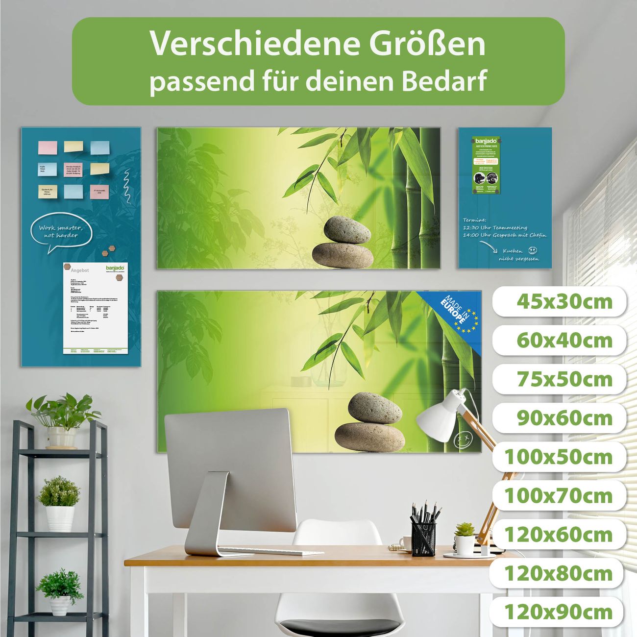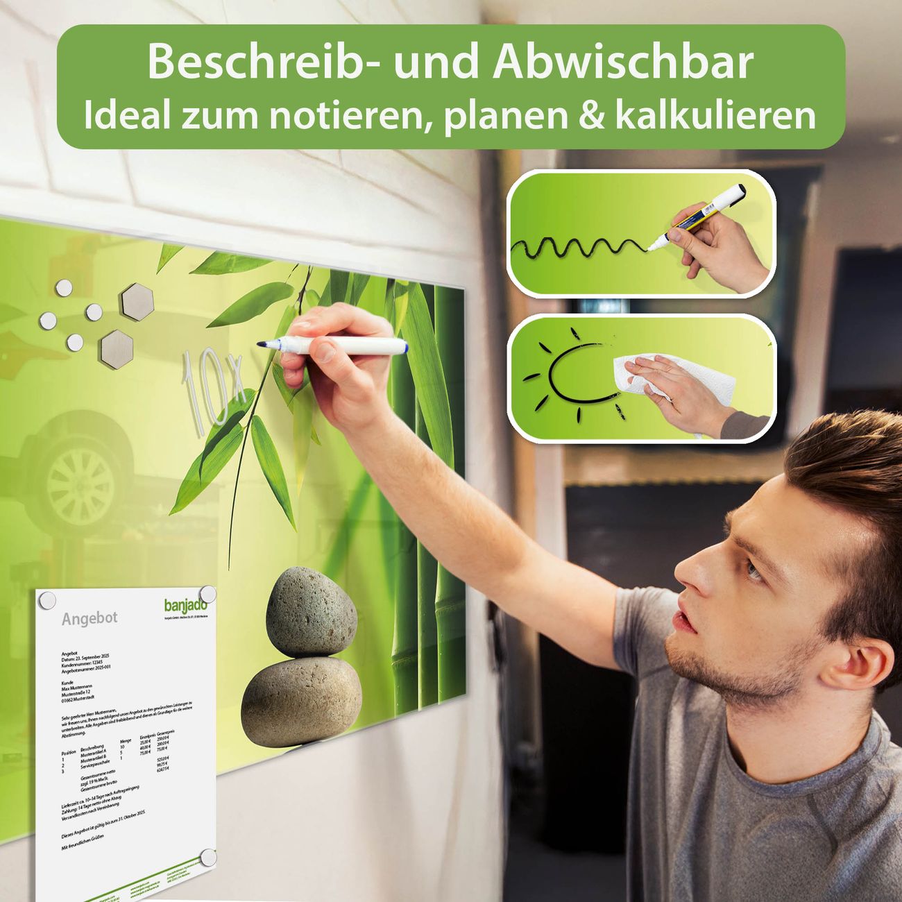 Material: 4mm Sicherheitsglas mit Metallrückwand Eigenschaften: beschreibbar, magnetisch, kratzfest Maße: 100x50x0,6cm, 7,50kg schwer Motiv Nummer 10887 Innere Ruhe Zubehör: inklusive 4 Neodym-Magnete