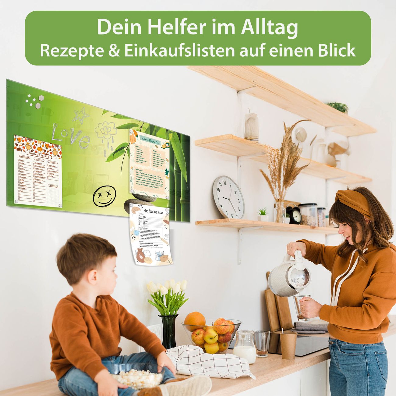 Auf der glatten Glasoberfläche lassen sich Termine, Rezepte oder Notizen ganz einfach mit Kreidestiften festhalten und rückstandslos entfernen. Starke Neodym-Magnete halten Ihre wichtigsten Erinnerungen sicher an Ort und Stelle. So entsteht Ihre ganz persönliche Ideenwand - jeden Tag neu.