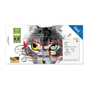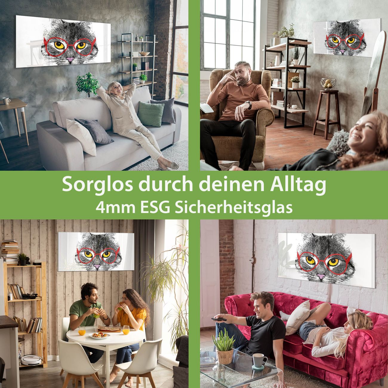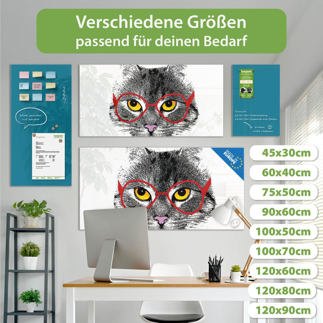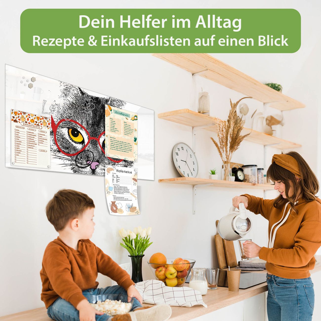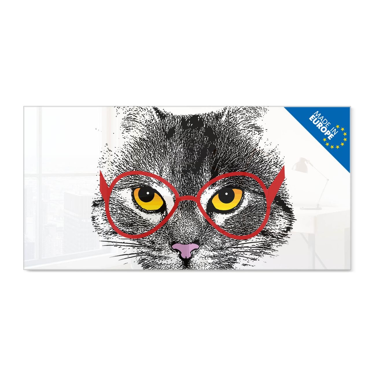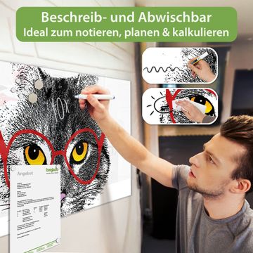Material: 4mm Sicherheitsglas mit Metallrückwand Eigenschaften: beschreibbar, magnetisch, kratzfest Maße: 100x50x0,6cm, 7,50kg schwer Motiv Nummer 11052 Intellicat Zubehör: inklusive 4 Neodym-Magnete