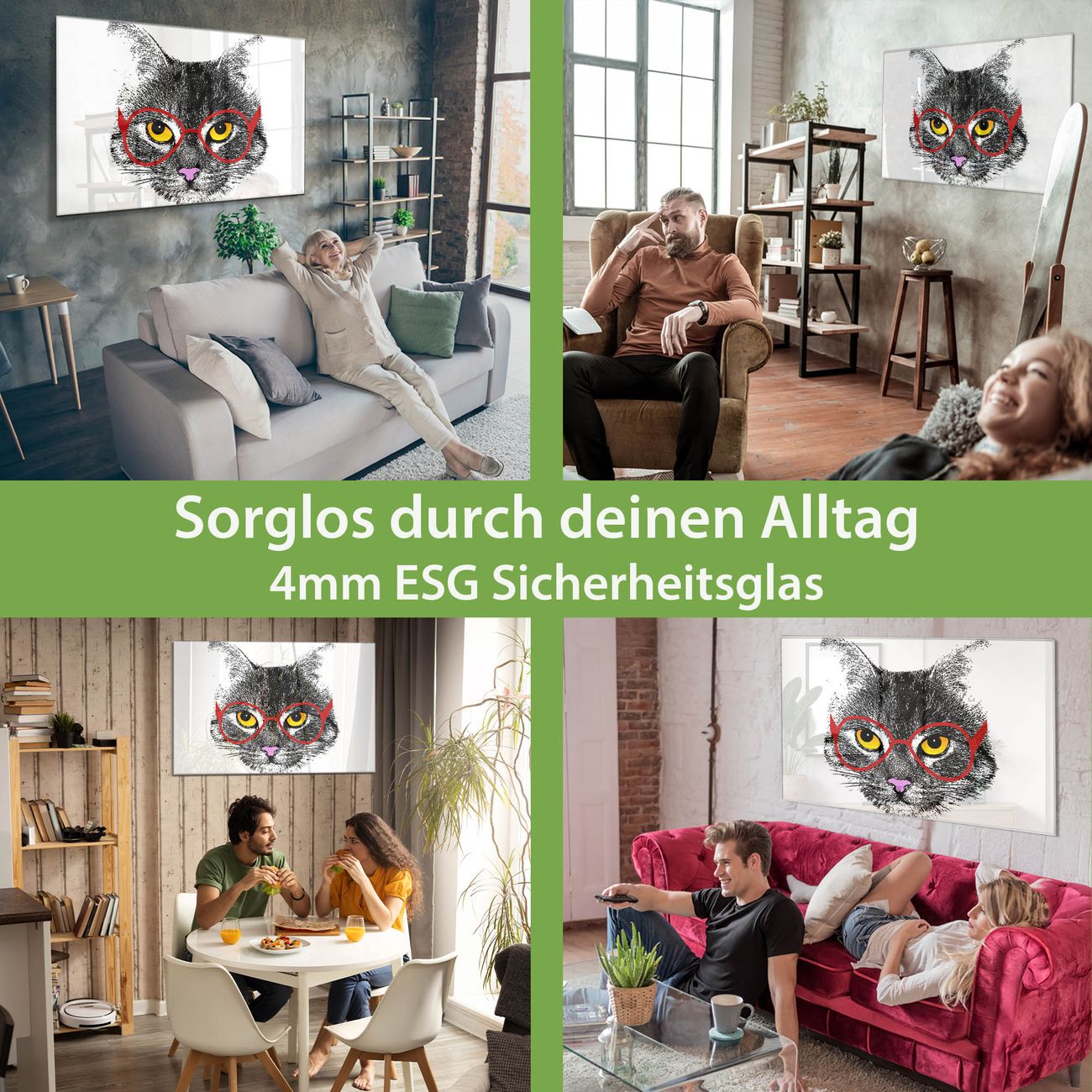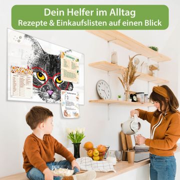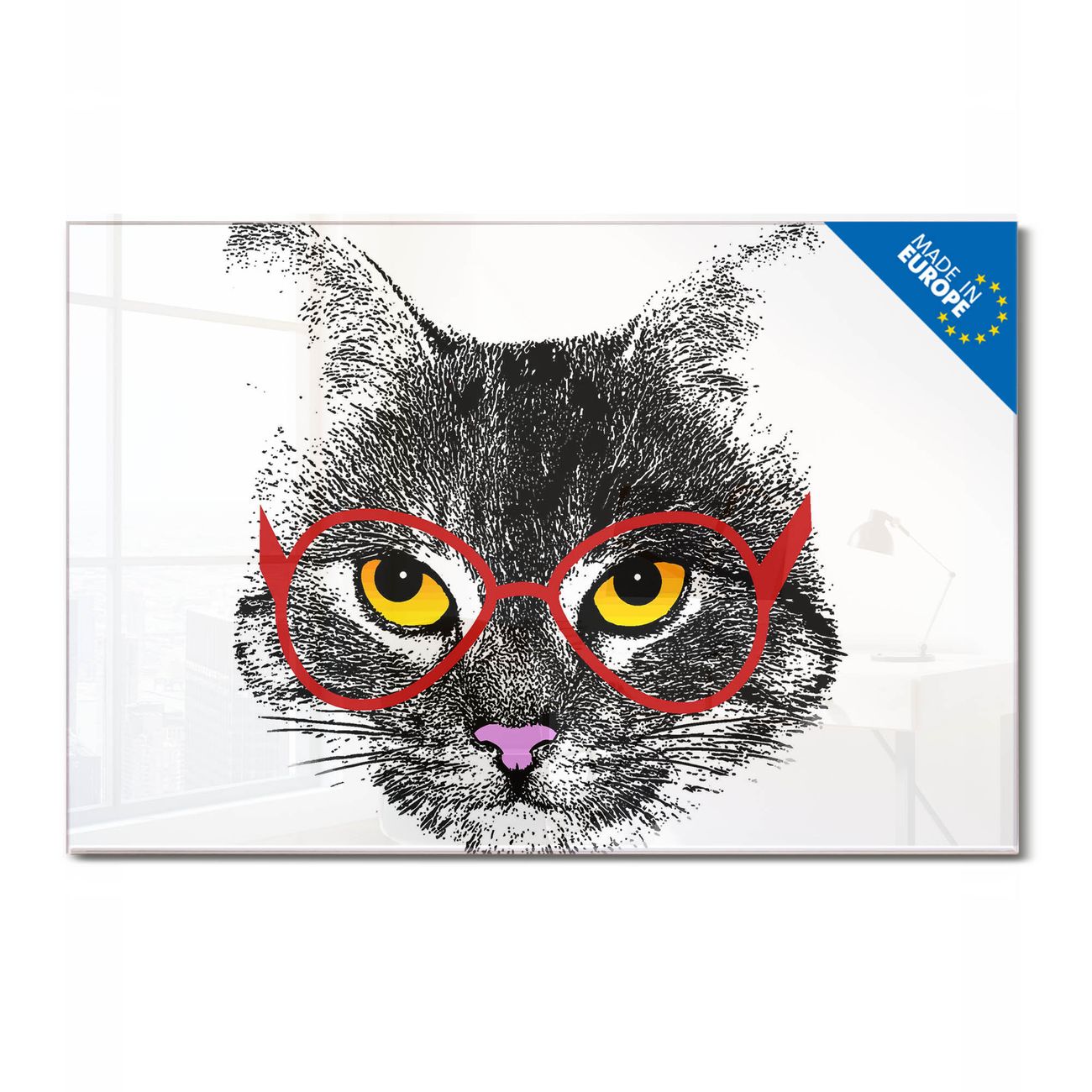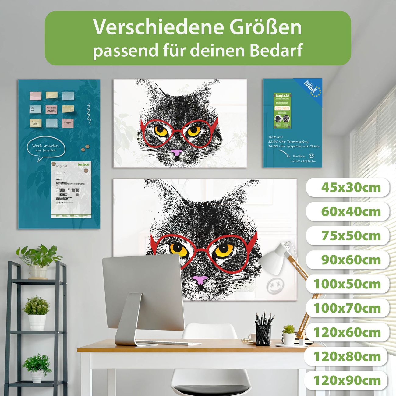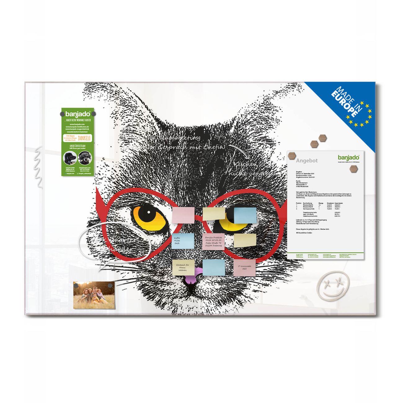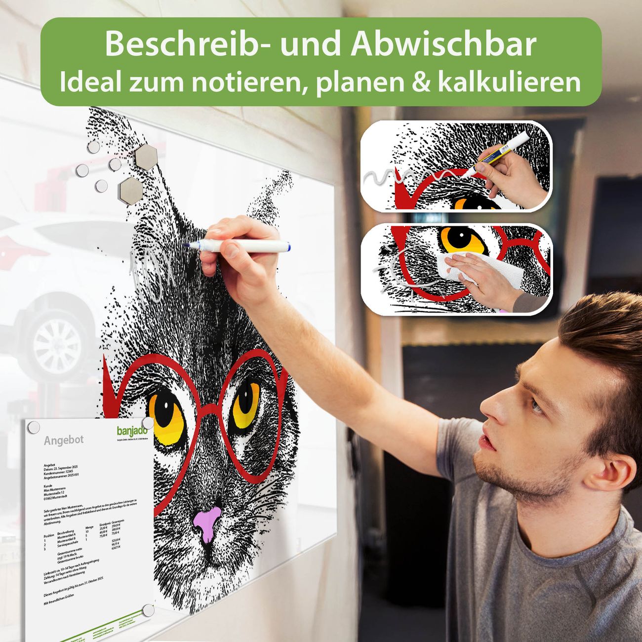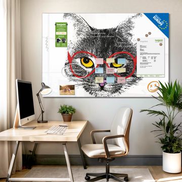 Material: 4mm Sicherheitsglas mit Metallrückwand Eigenschaften: beschreibbar, magnetisch, kratzfest Maße: 120x80x0,6cm, 14,40kg schwer Motiv Nummer 11052 Intellicat Zubehör: inklusive 4 Neodym-Magnete