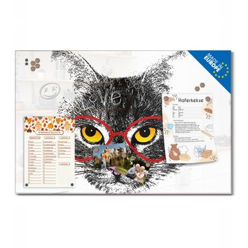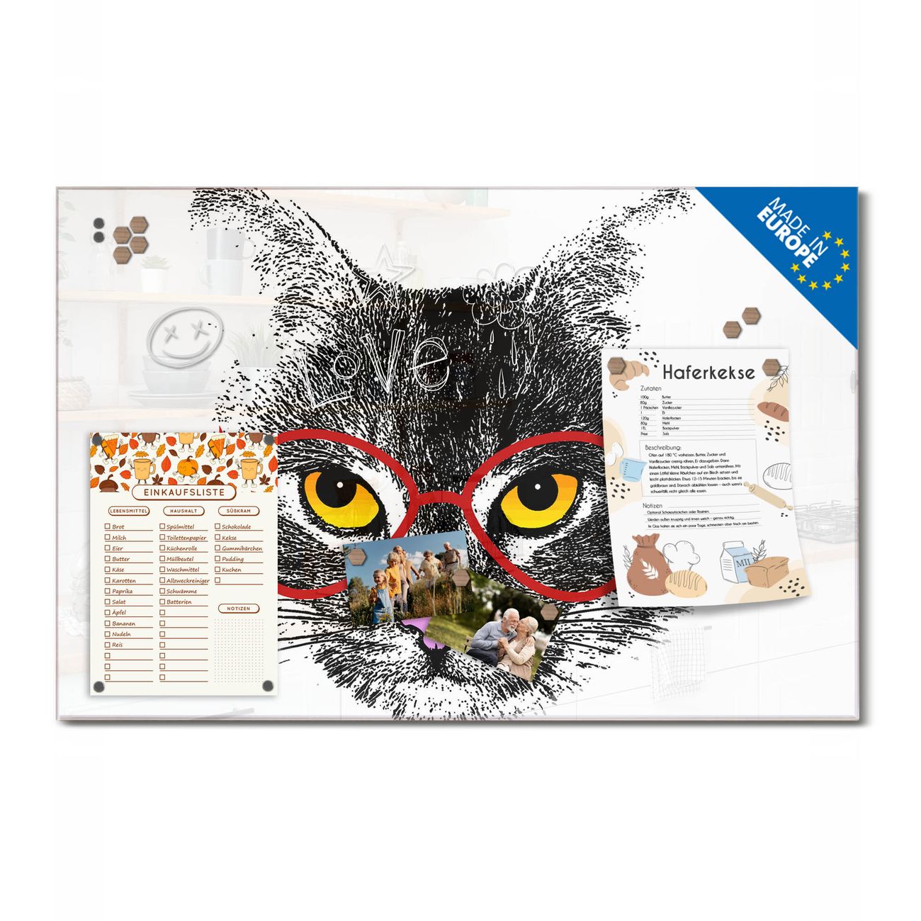 Material: 4mm Sicherheitsglas mit Metallrückwand Eigenschaften: beschreibbar, magnetisch, kratzfest Maße: 75x50x0,6cm, 5,63kg schwer Motiv Nummer 11052 Intellicat Zubehör: inklusive 4 Neodym-Magnete