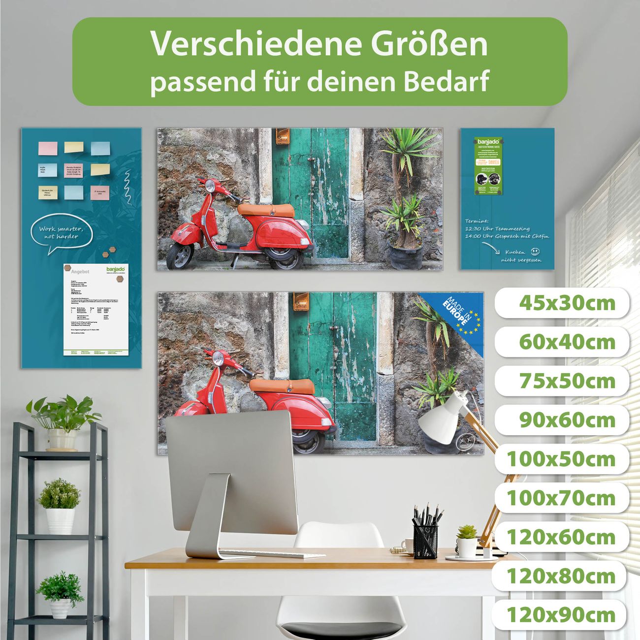 Material: 4mm Sicherheitsglas mit Metallrückwand Eigenschaften: beschreibbar, magnetisch, kratzfest Maße: 120x60x0,6cm, 10,80kg schwer Motiv Nummer 10071 Italienischer Roller Zubehör: inklusive 4 Neodym-Magnete