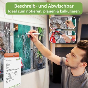 Auf der glatten Glasoberfläche lassen sich Termine, Rezepte oder Notizen ganz einfach mit Kreidestiften festhalten und rückstandslos entfernen. Starke Neodym-Magnete halten Ihre wichtigsten Erinnerungen sicher an Ort und Stelle. So entsteht Ihre ganz persönliche Ideenwand - jeden Tag neu.