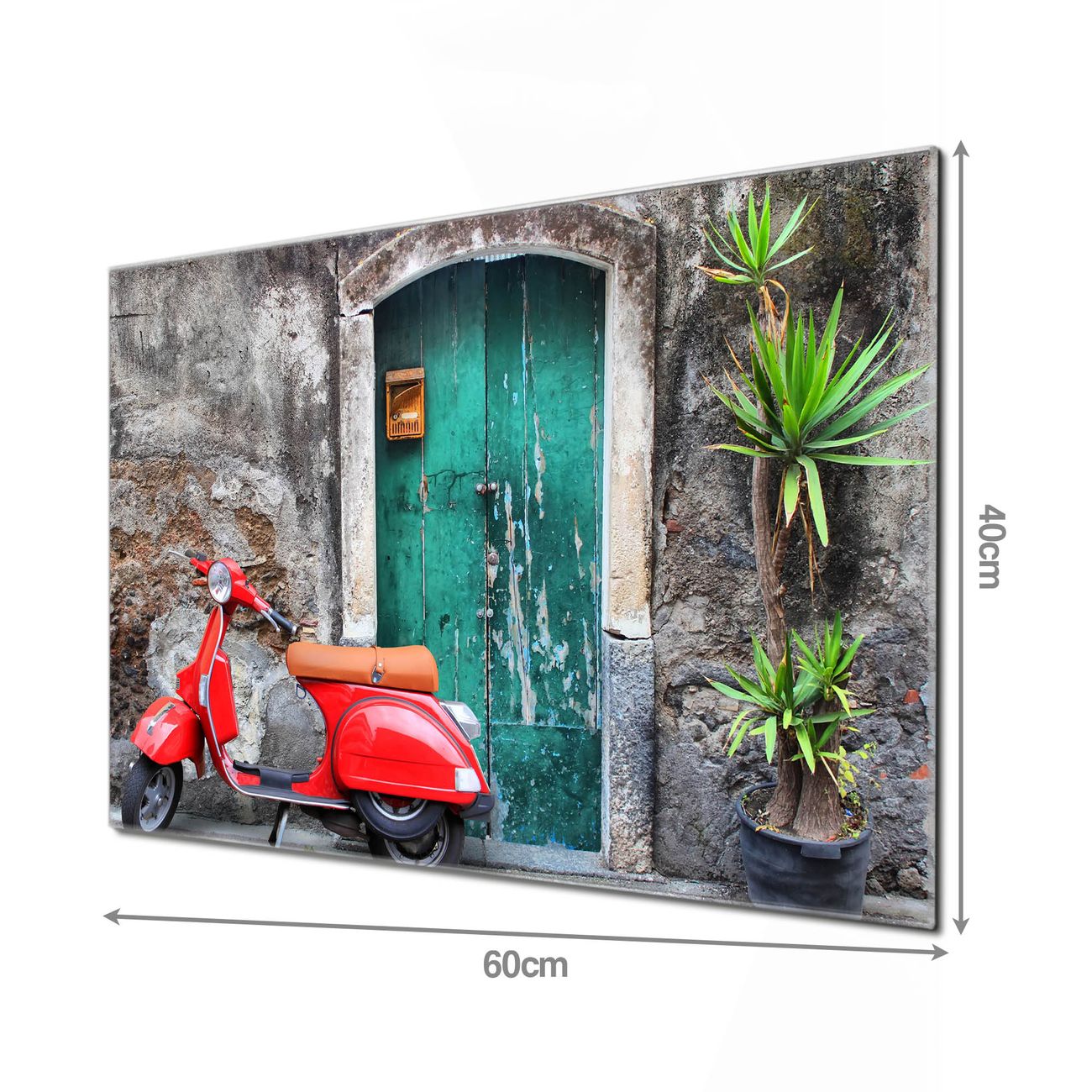 Material  4mm Sicherheitsglas mit Metallrückwand Eigenschaften  beschreibbar, magnetisch, kratzfest Maße  60x40x0,6cm, 3,6kg schwer Motiv  Nummer 10071 Italienischer Roller Zubehör  inklusive 4 Neodym-Magnete