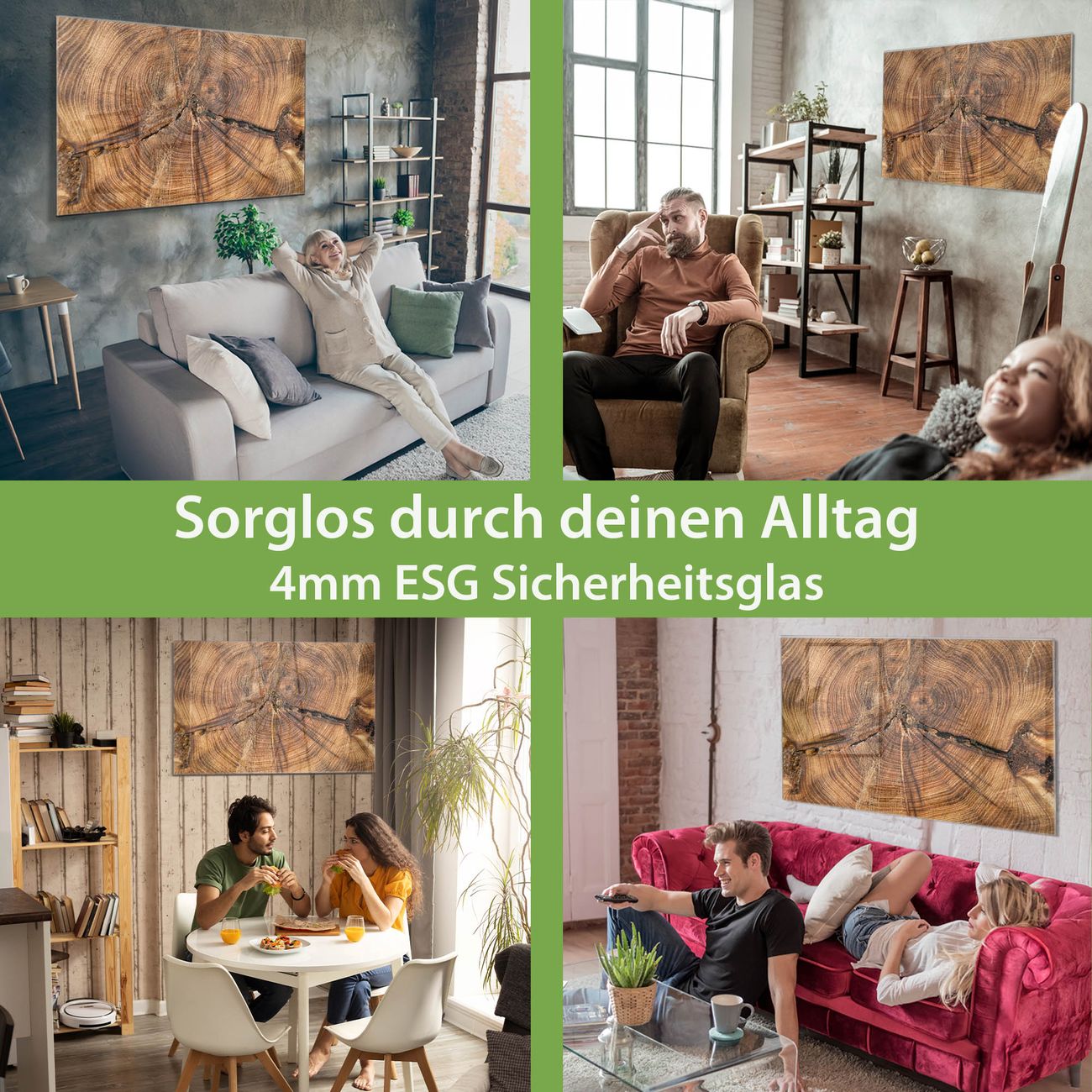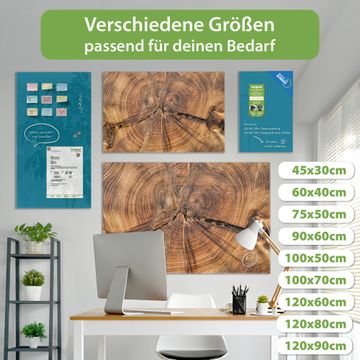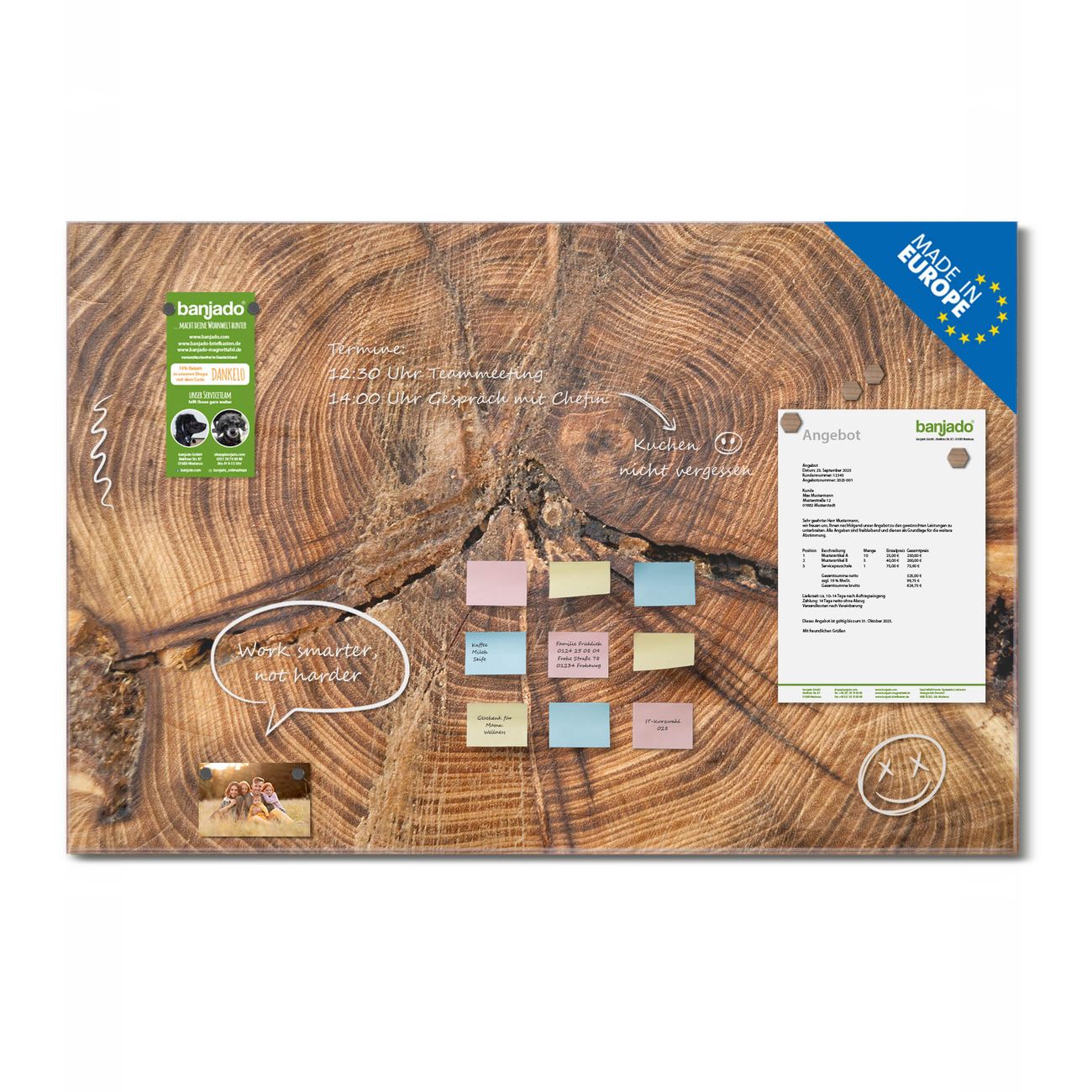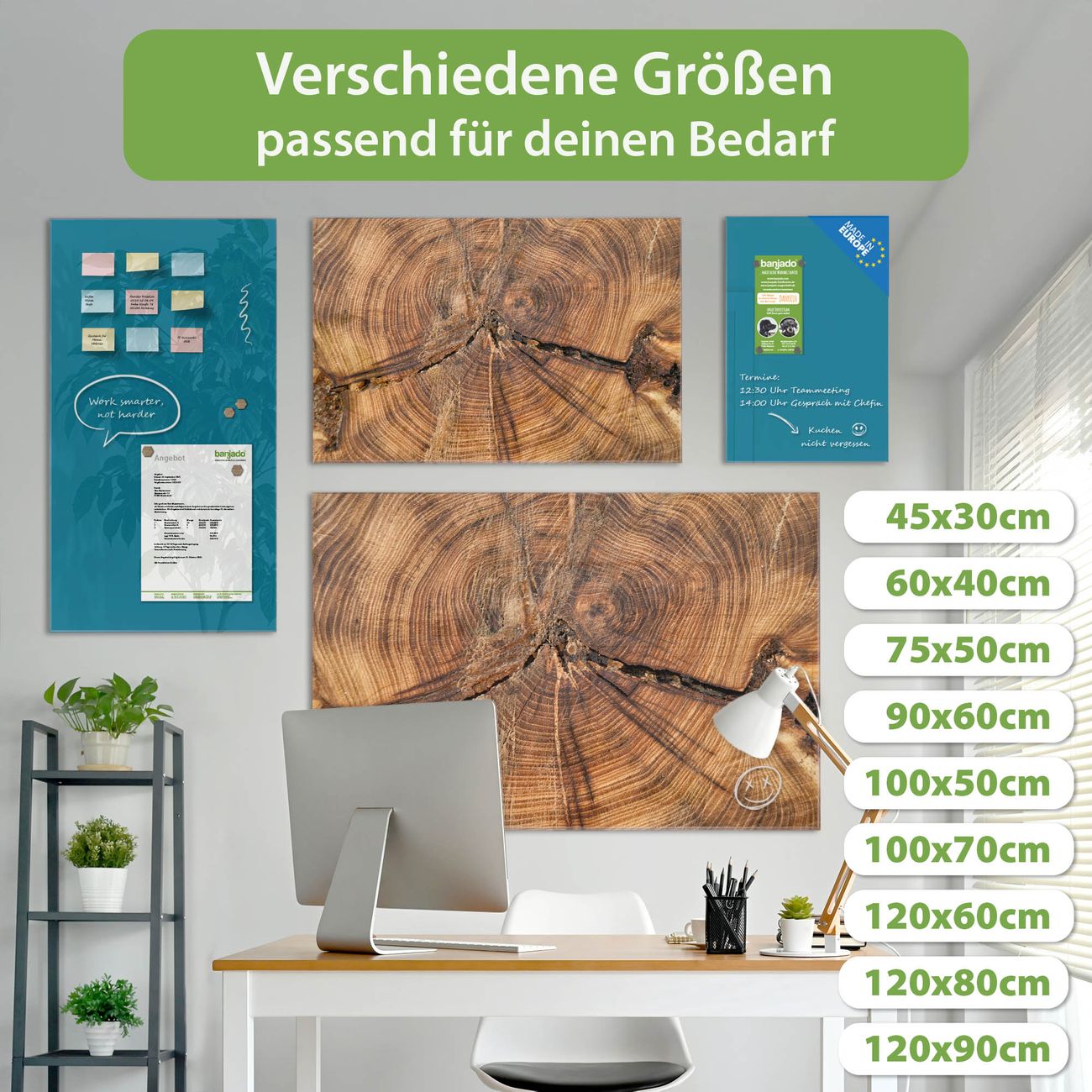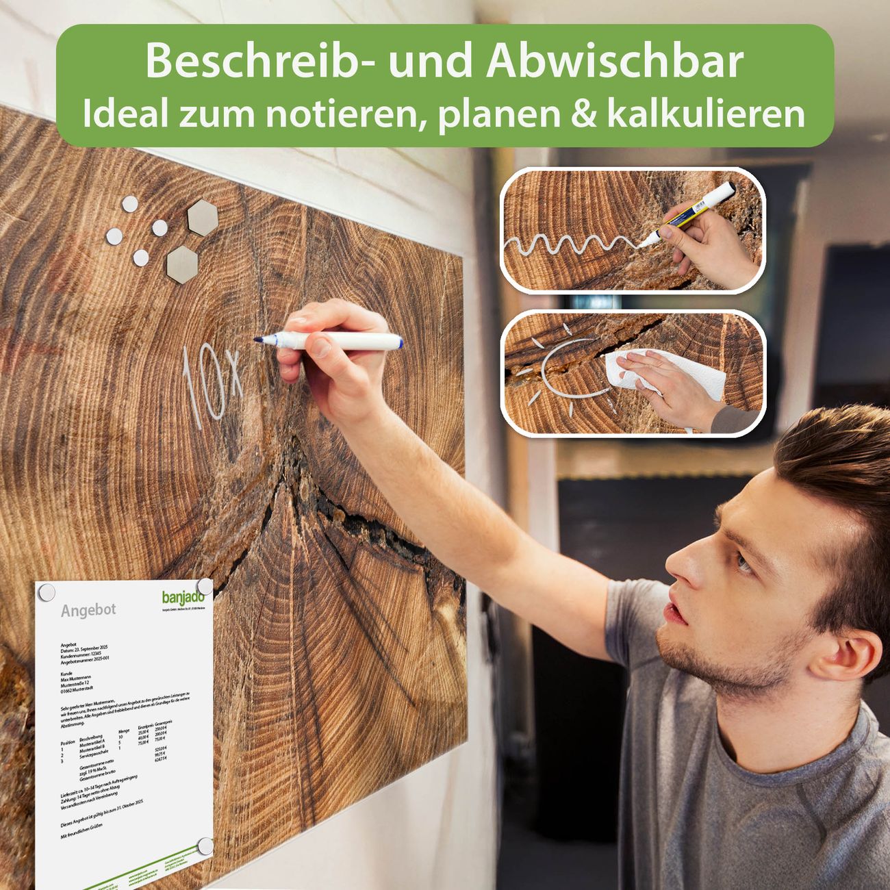 Material: 4mm Sicherheitsglas mit Metallrückwand Eigenschaften: beschreibbar, magnetisch, kratzfest Maße: 120x80x0,6cm, 14,40kg schwer Motiv Nummer 11997 Jahresringe Zubehör: inklusive 4 Neodym-Magnete