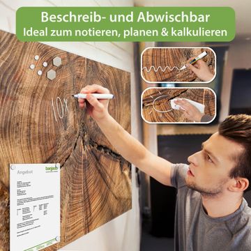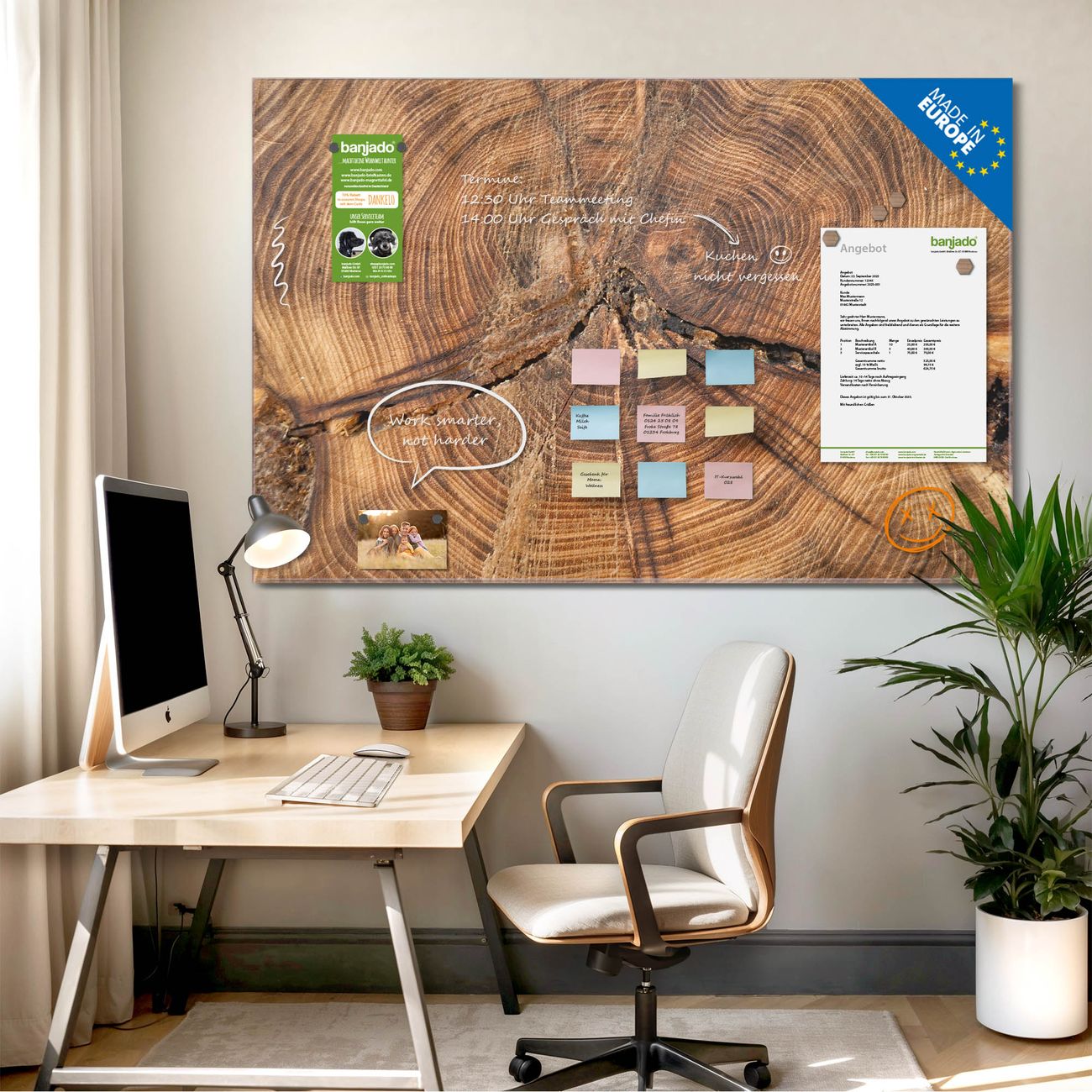 Die banjado Glas Magnettafel mit dem Motiv Motiv Jahresringe verbindet Funktionalität mit Stil. Sie ersetzt das Zettelchaos durch klare Strukturen und bringt dabei eine warme, natürliche Atmosphäre in Ihr Zuhause. Ob im Büro, in der Küche oder im Eingangsbereich - dieses Design-Board zieht Blicke an und sorgt für Ordnung mit Charakter.