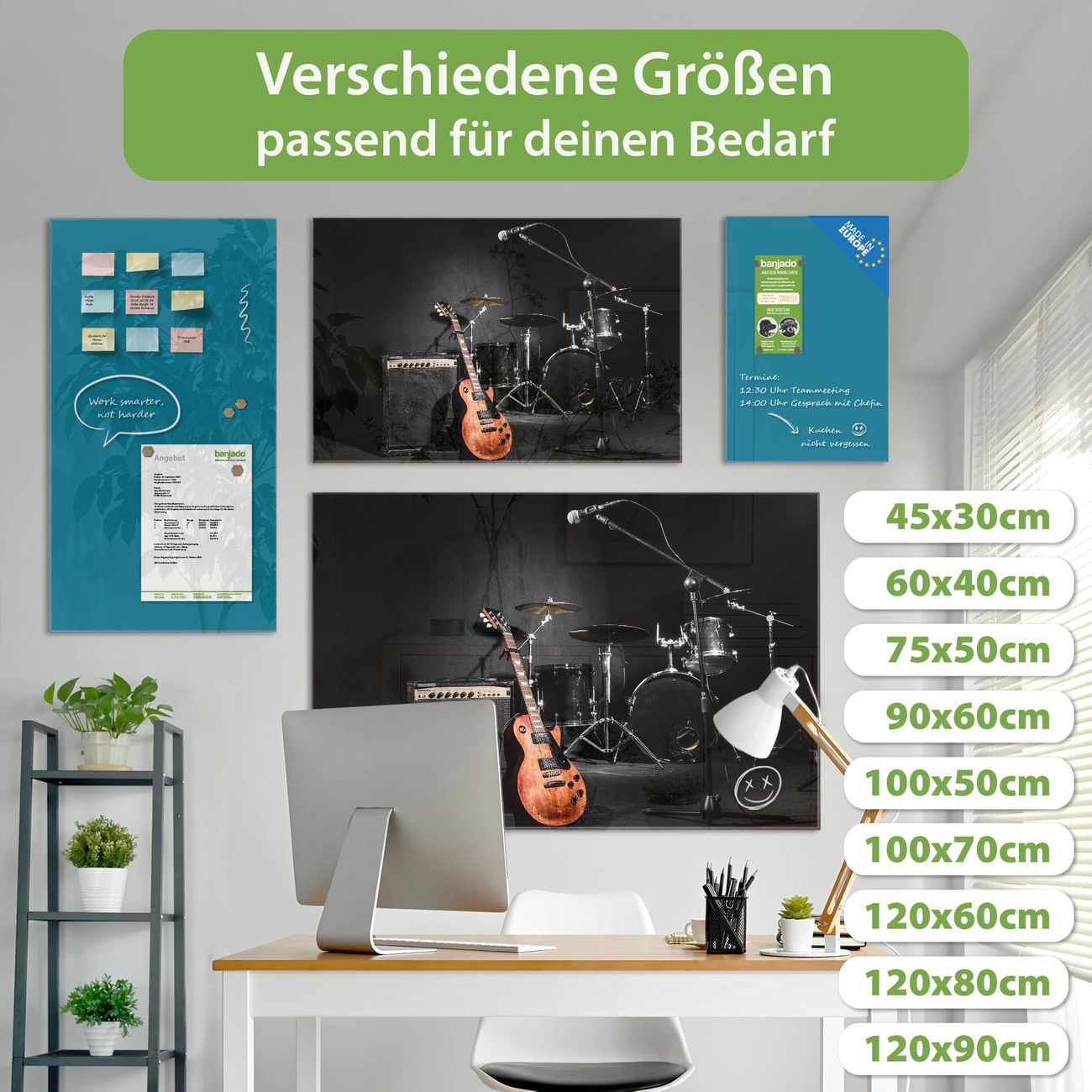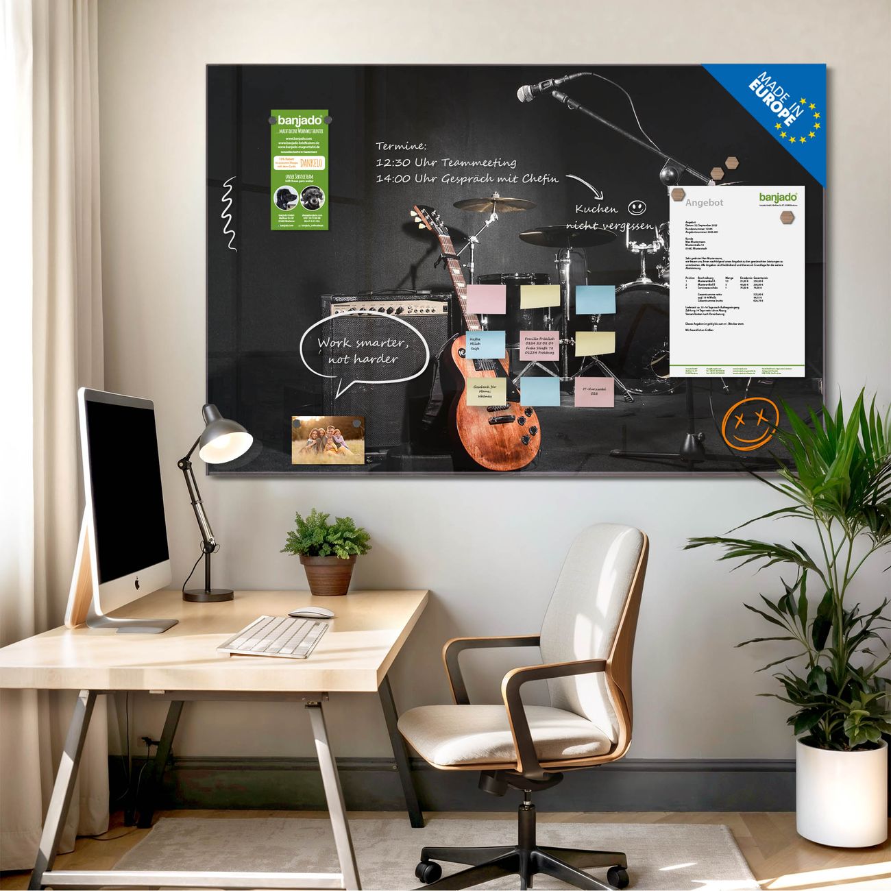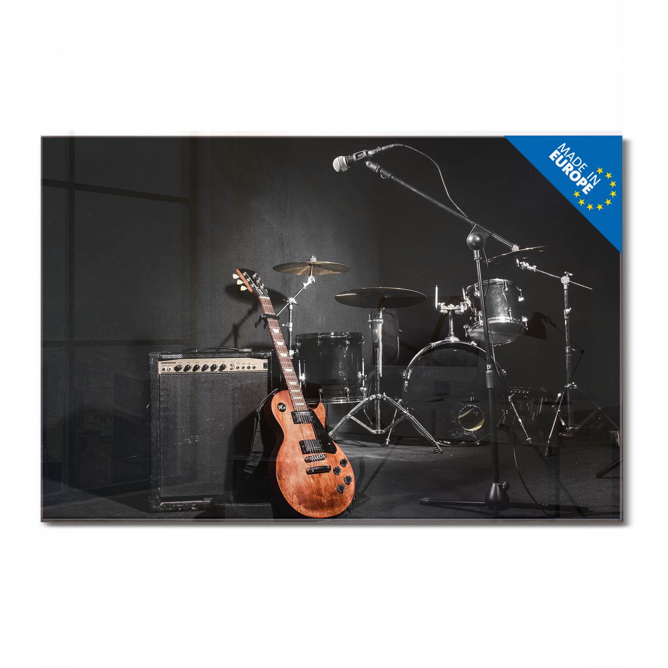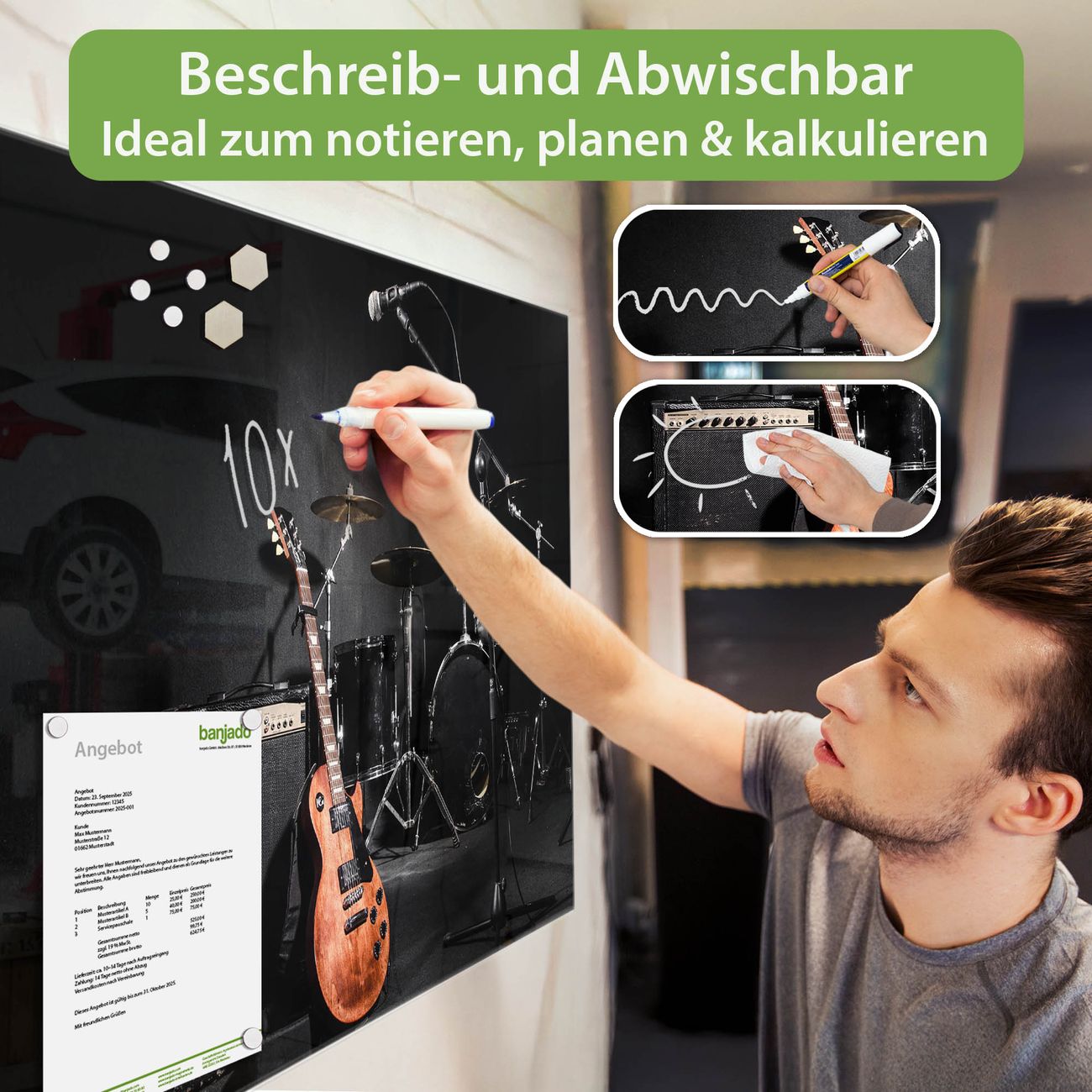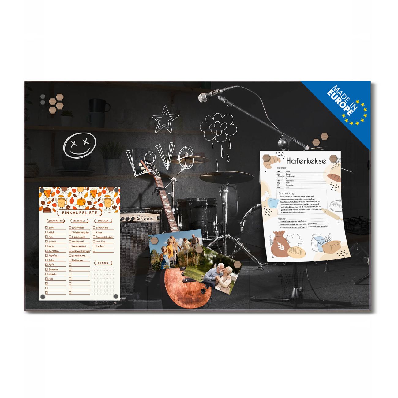 Material: 4mm Sicherheitsglas mit Metallrückwand Eigenschaften: beschreibbar, magnetisch, kratzfest Maße: 75x50x0,6cm, 5,63kg schwer Motiv Nummer 11224 Jam Session Zubehör: inklusive 4 Neodym-Magnete
