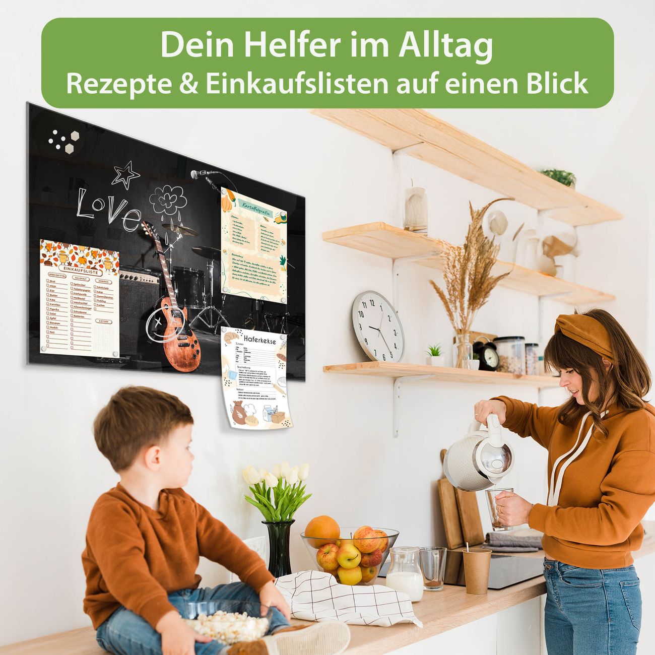 Ein Stück Design, das Ihren Alltag organisiert. Schreiben, heften, inspirieren - alles an einem Ort. Qualität, die man spürt. Montage leicht gemacht. Handwerk mit Herz - veredelt in Sachsen. Einzigartiges Design mit Motiv Motiv Jam Session Beschreibbare Glasoberfläche, leicht zu reinigen Starke Magnetkraft durch Stahlrückwand Inklusive 4 Neodym-Magneten Flexible Montageoptionen Handveredelt in Sachsen - Qualität, die bleibt