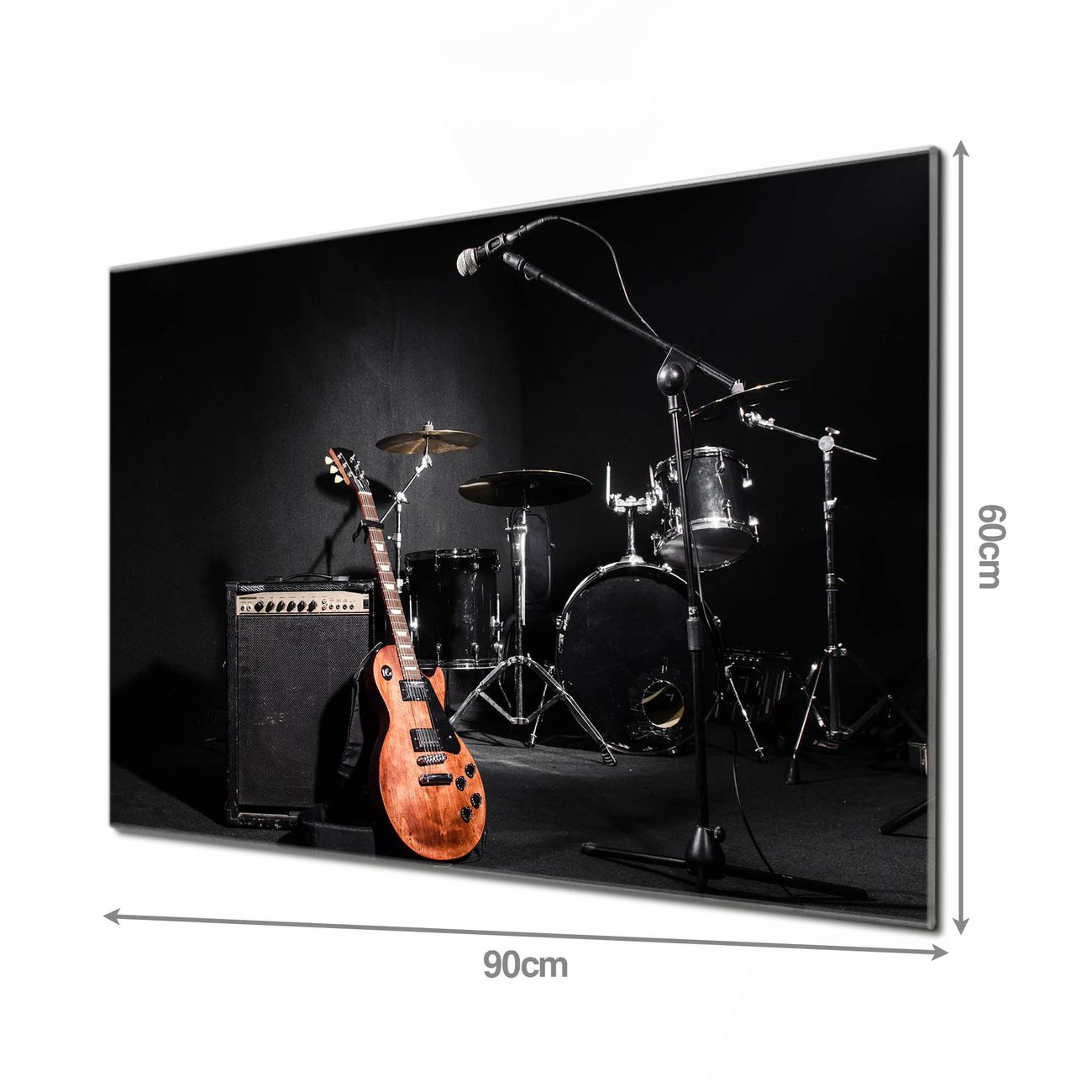 Material: 4mm Sicherheitsglas mit Metallrückwand Eigenschaften: beschreibbar, magnetisch, kratzfest Maße: 90x60x0,6cm, 8,10kg schwer Motiv Nummer 11224 Jam Session Zubehör: inklusive 4 Neodym-Magnete