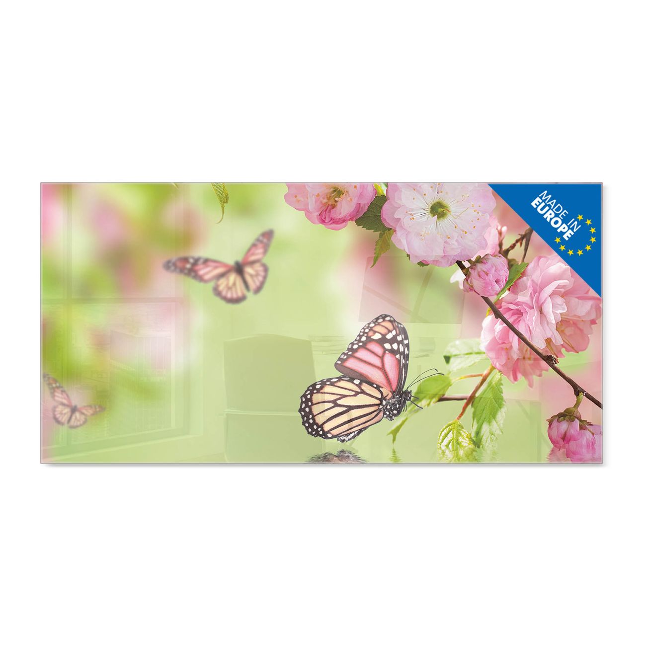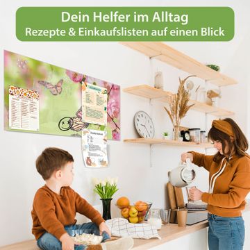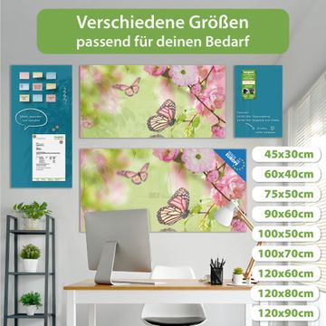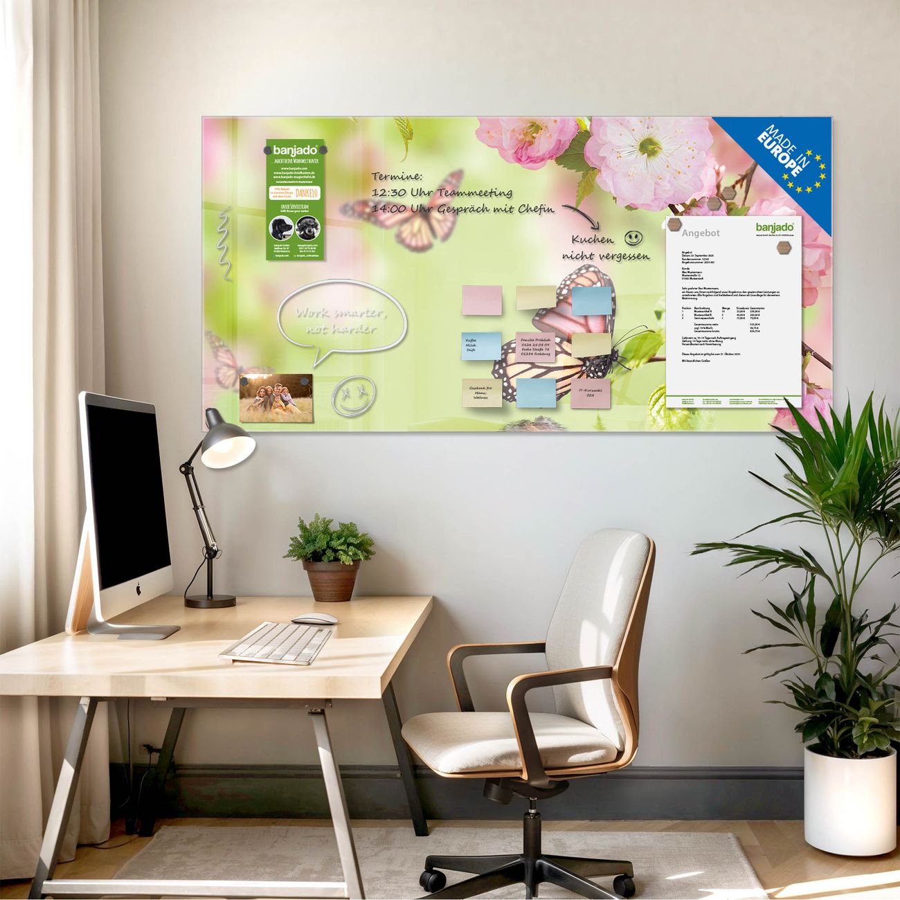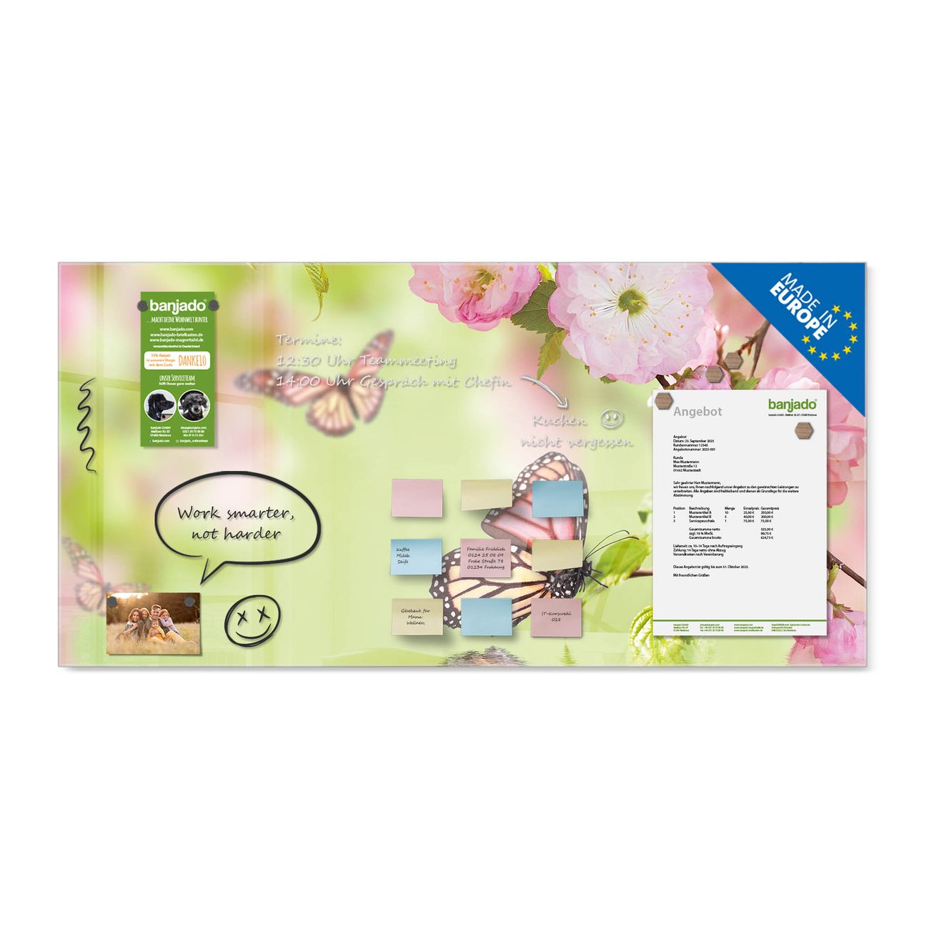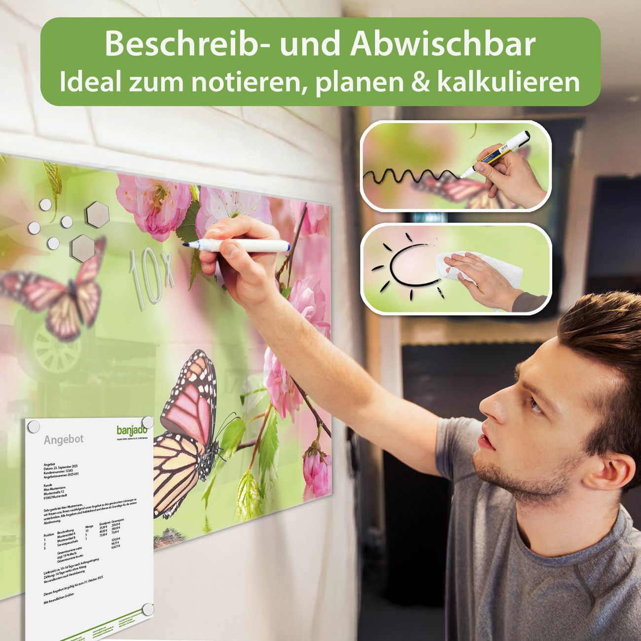 Material: 4mm Sicherheitsglas mit Metallrückwand Eigenschaften: beschreibbar, magnetisch, kratzfest Maße: 100x50x0,6cm, 7,50kg schwer Motiv Nummer 11139 Japanische Kirschblüte Zubehör: inklusive 4 Neodym-Magnete