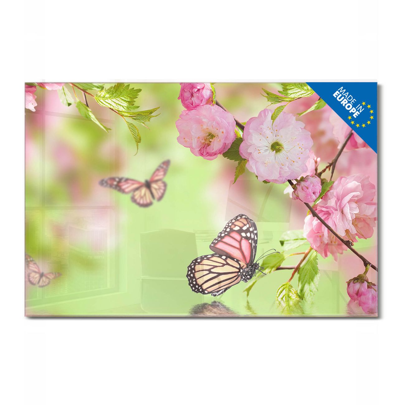 Material: 4mm Sicherheitsglas mit Metallrückwand Eigenschaften: beschreibbar, magnetisch, kratzfest Maße: 45x30x0,6cm, 2,03kg schwer Motiv Nummer 11139 Japanische Kirschblüte Zubehör: inklusive 4 Neodym-Magnete