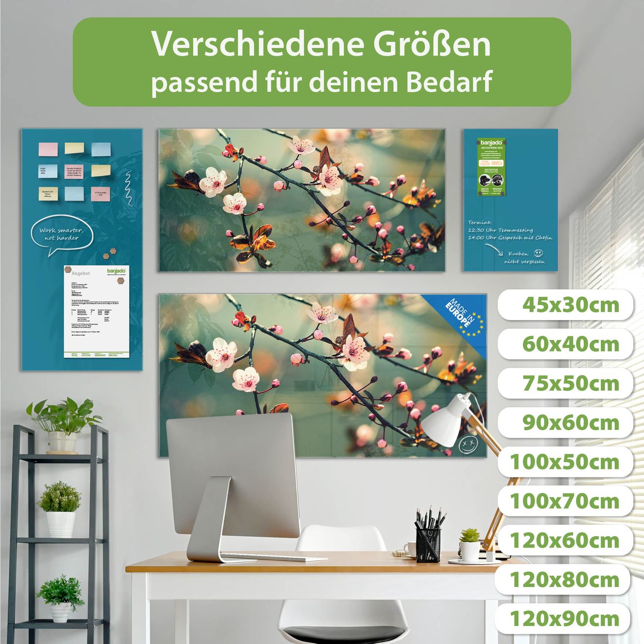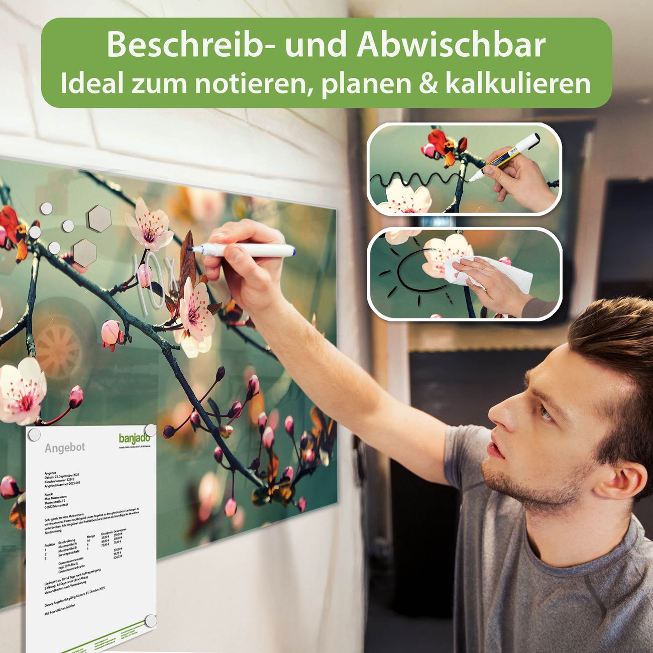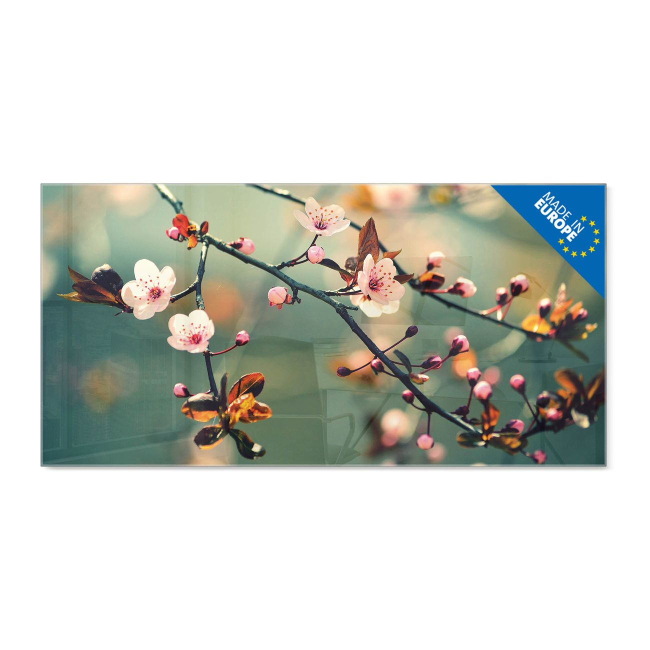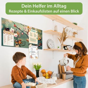 Material: 4mm Sicherheitsglas mit Metallrückwand Eigenschaften: beschreibbar, magnetisch, kratzfest Maße: 100x50x0,6cm, 7,50kg schwer Motiv Nummer 12761 Japankirsche Zubehör: inklusive 4 Neodym-Magnete