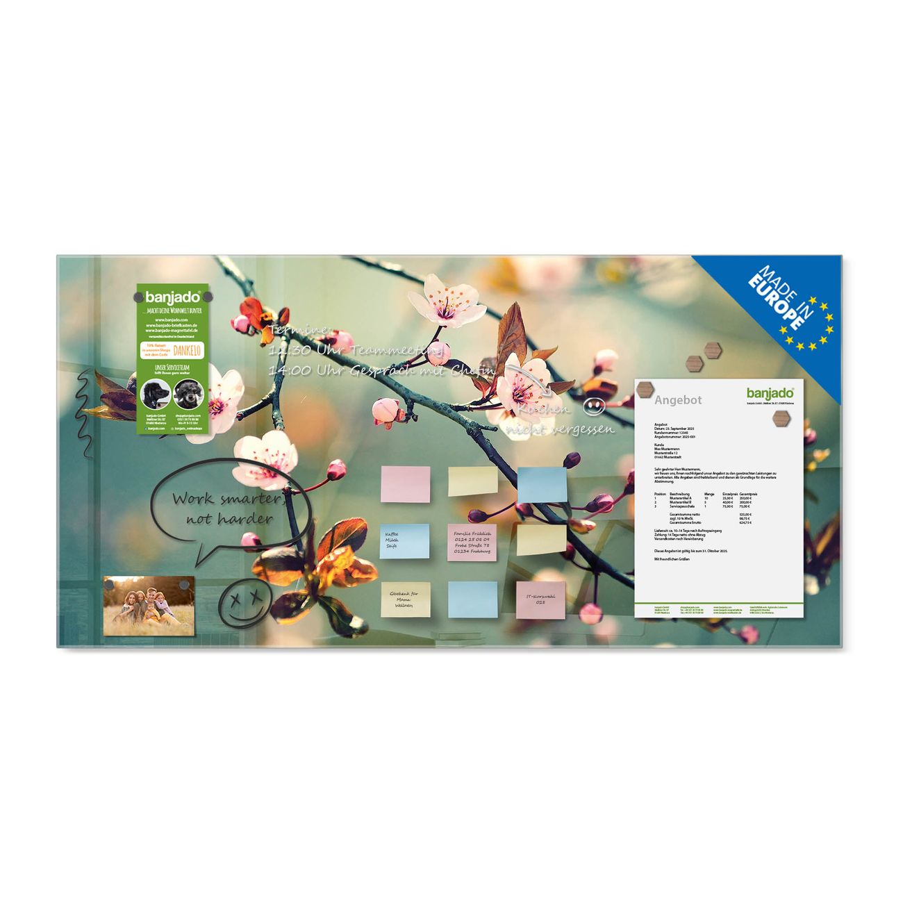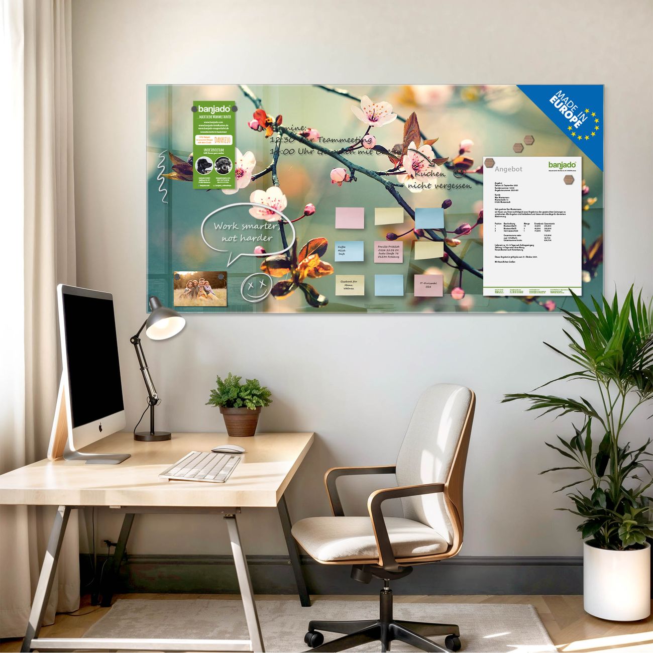 Jede Glas Magnettafel wird in unserer Werkstatt von Hand gefertigt und sorgfältig geprüft. So erhalten Sie ein echtes Qualitätsprodukt, das Funktion und Ästhetik perfekt vereint.?? Warum banjado?
